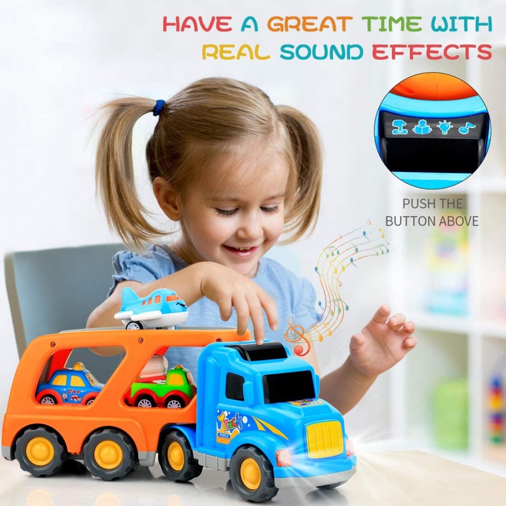 - Este juego de juguetes consta de 9 piezas de coches, incluyendo 8 coches pequeños y un camión de transporte grande. Todos los vehículos de este juego son de colores vivos, iluminando así los días de tus niños pequeños con toda la felicidad. Tamaño del remolque de transporte: 13.5 x 5.5 pulgadas, tamaño de coches pequeños: 2.5 x 1.6 pulgadas