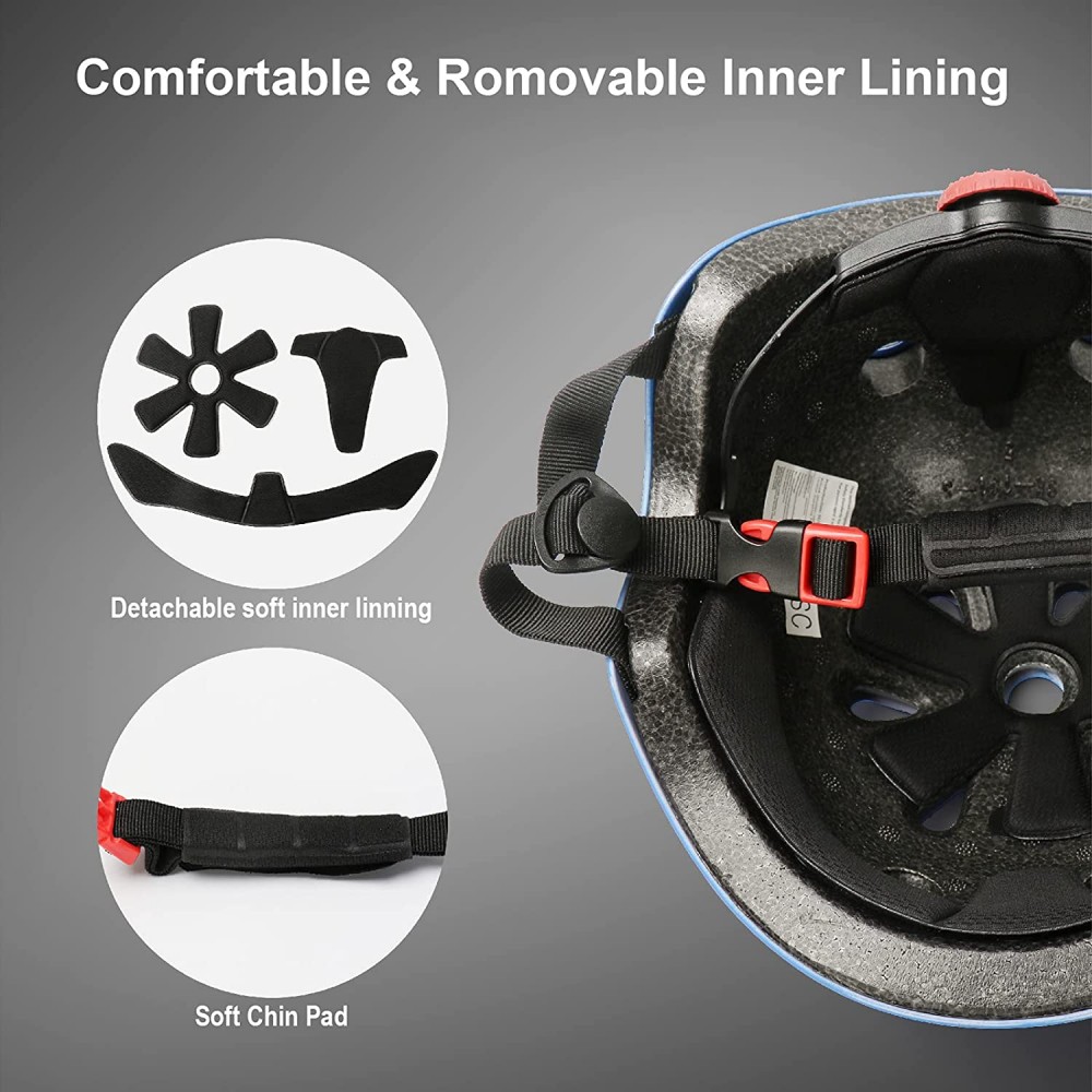 - Ajustable y ligero: este casco de bicicleta para niños es muy ligero, no causará ninguna carga a la cabeza de tu hijo incluso durante mucho tiempo. Nuestro casco de monopatín para niños está equipado con un dial de ajuste flexible y una correa de barbilla agradable al tacto que proporciona a tus hijos un ajuste perfecto para la cabeza. Dos tamaños para elegir: pequeño (18.9-21.3 in), mediano (21.3-22.8 in)