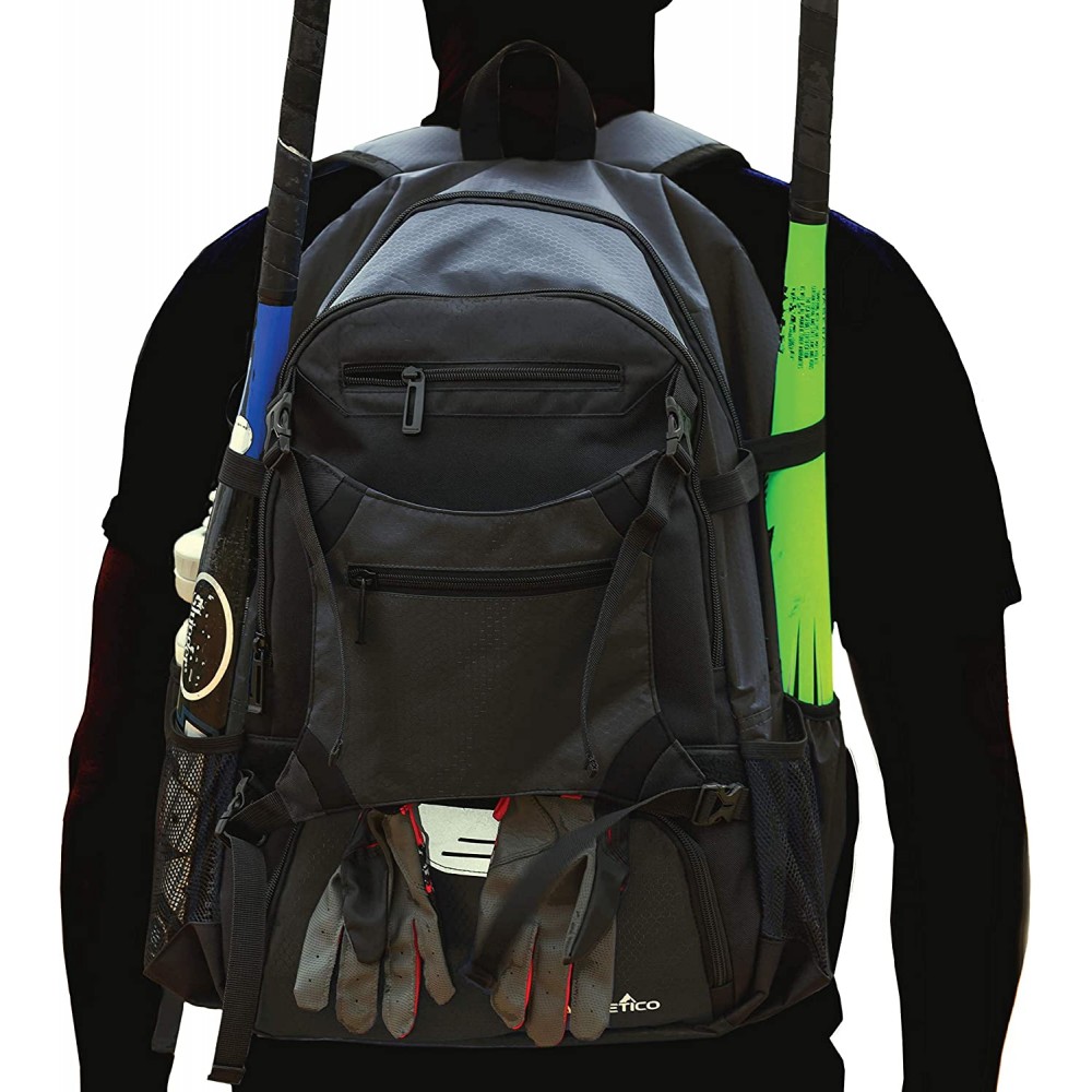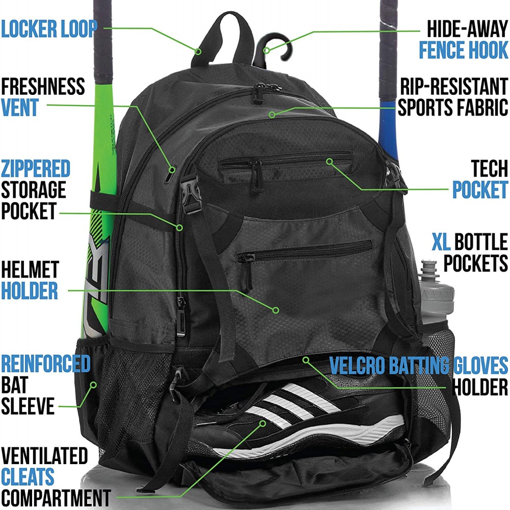 - Mantente listo para jugar con todo tu equipo en un solo lugar. Perfecto para todos, jóvenes y adultos: diseñado con espacio para todos tus equipos de béisbol, cada bolsa almacena dos bates, un casco de béisbol, guantes de bateo, tacos, gorra de béisbol y guante de captura. No te conformes con una bolsa que ni siquiera puede adaptarse a tu casco de béisbol.