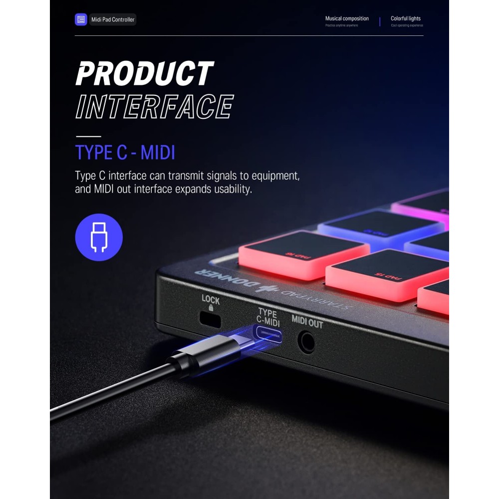 - Potente compatibilidad: la máquina de beat viene con una fuente de alimentación USB C estándar e interfaz de datos para conectar y usar fácilmente. Recomendación: si quieres conectarte a tu iPhone o iPad, necesitas comprar un adaptador Apple Lightning a USB). La entrada y salida MIDI adicional te permite conectarte a un sintetizador externo u otro equipo MIDI. Así que no importa cómo lo utilices, el pad de música STARRYPAD proporciona compatibilidad con la que puedes confiar. (Viene con cable USB, adaptador tipo C y cable MIDI).