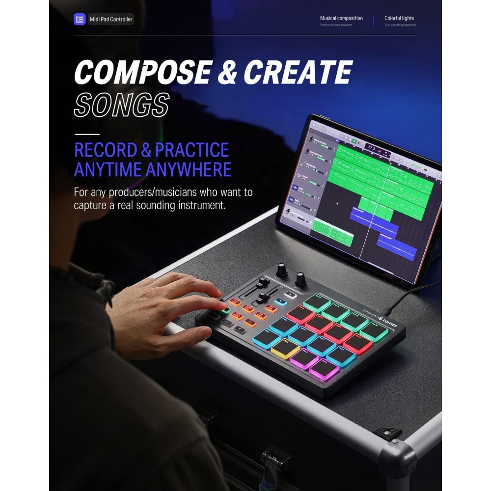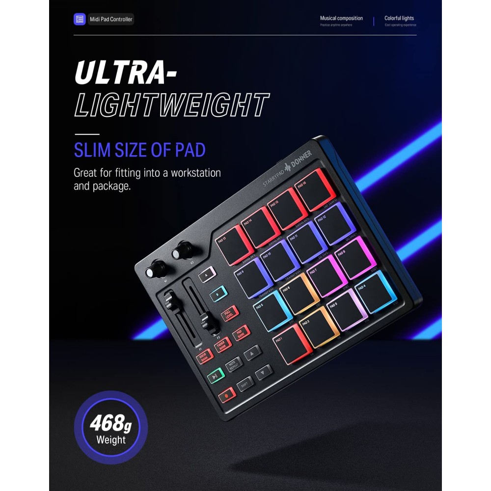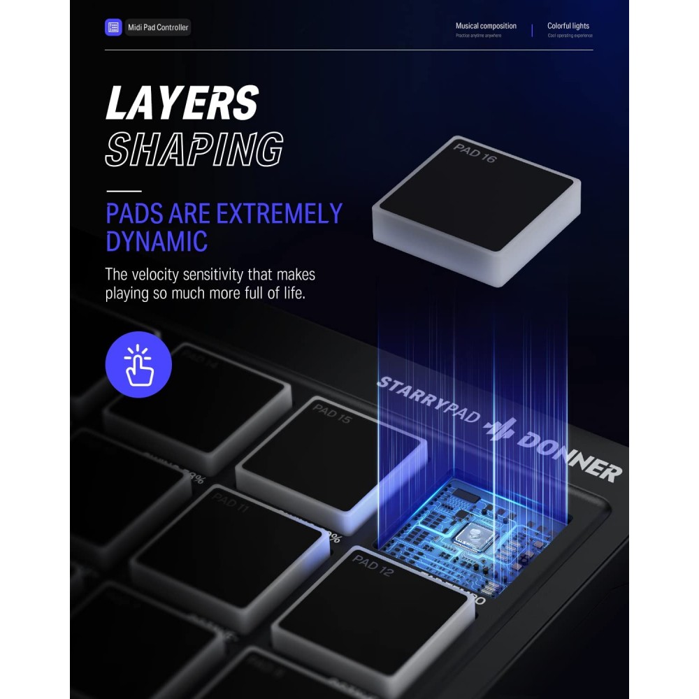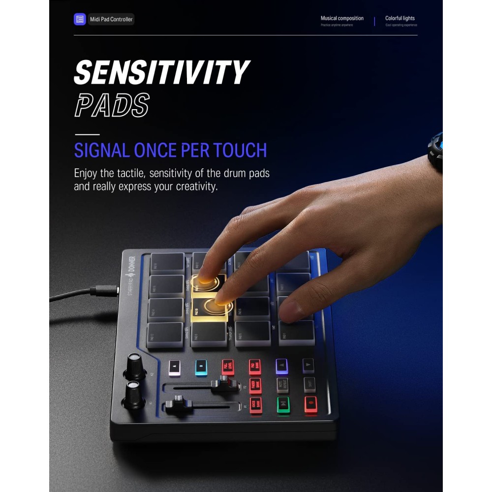 Donner MIDI Pad Beat Maker con 16 almohadillas de ritmo, 2 atenuadores y software de producción,controlador USB MIDI Pad STARRYPAD