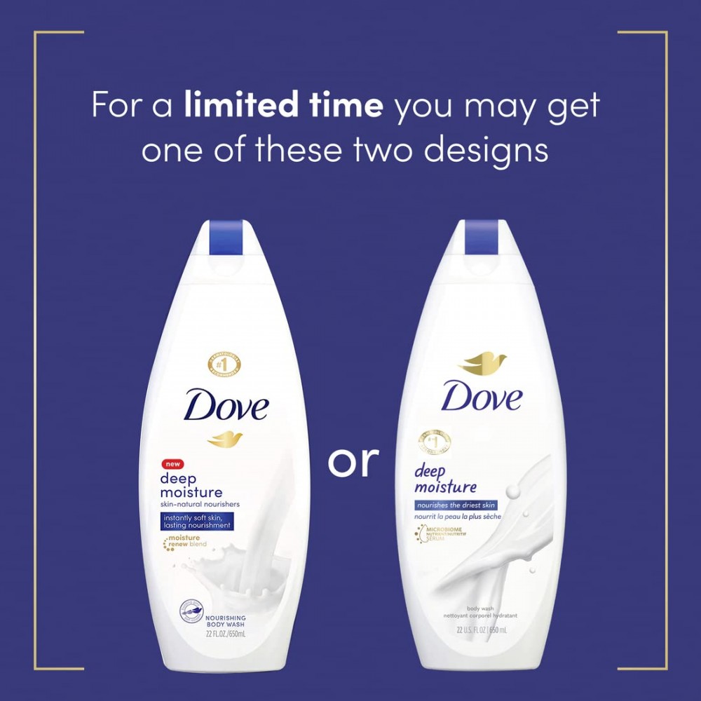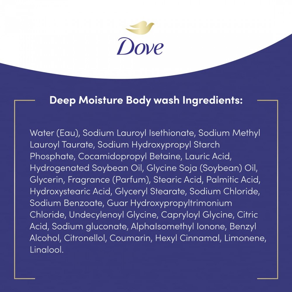 - Suave y con pH balanceado: Dove Body Wash incluye Moisture Renew Blend, una combinación de nutrientes naturales para la piel e hidratantes vegetales que absorben profundamente en las capas superiores de la piel.