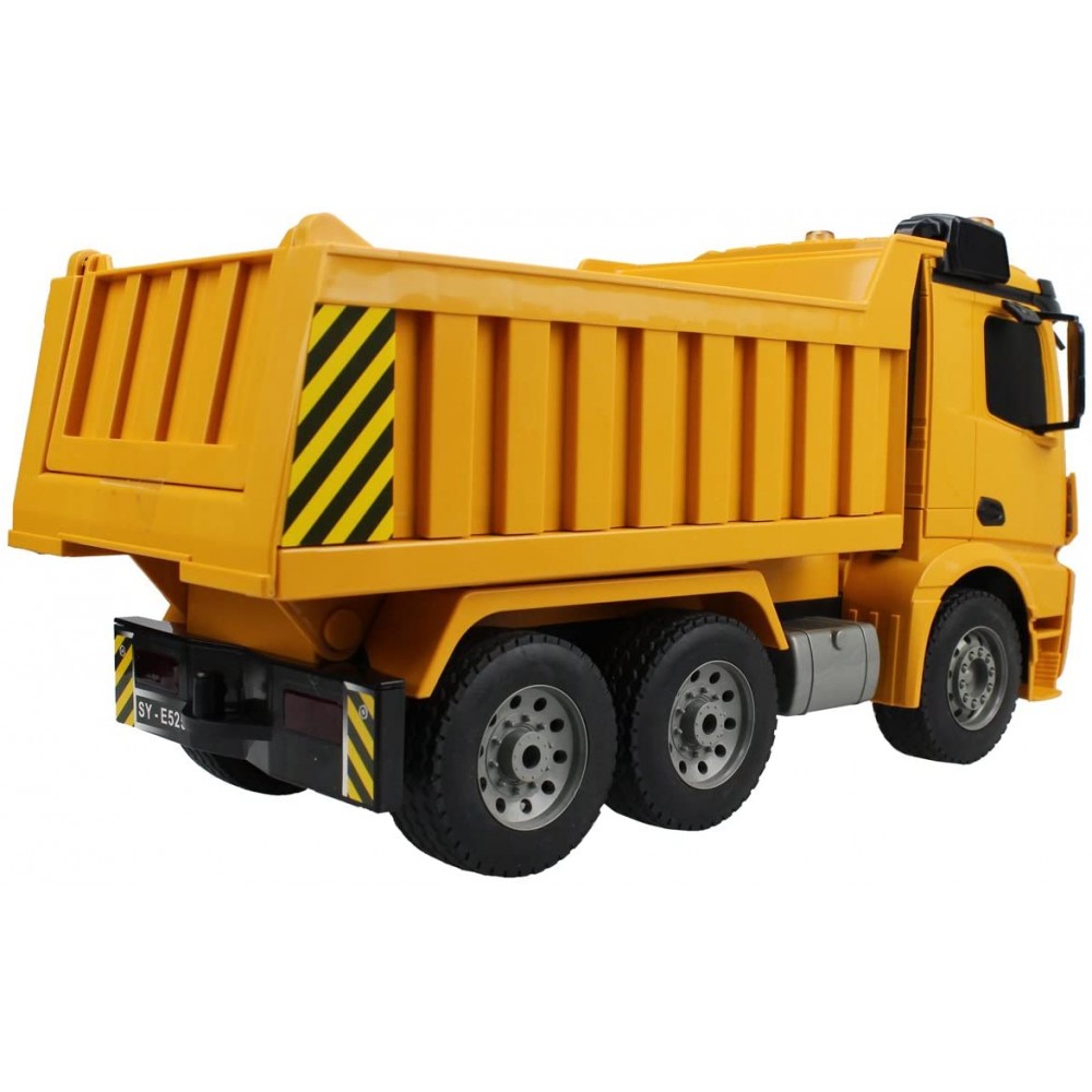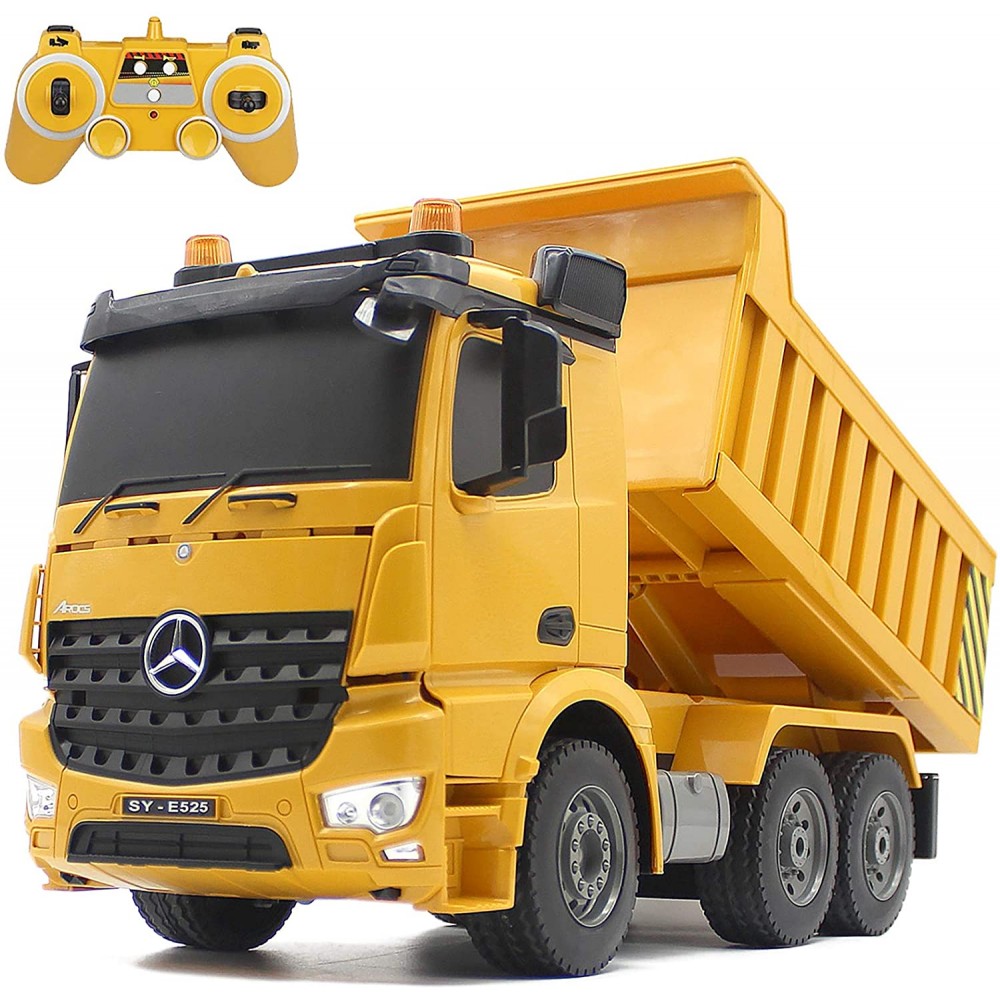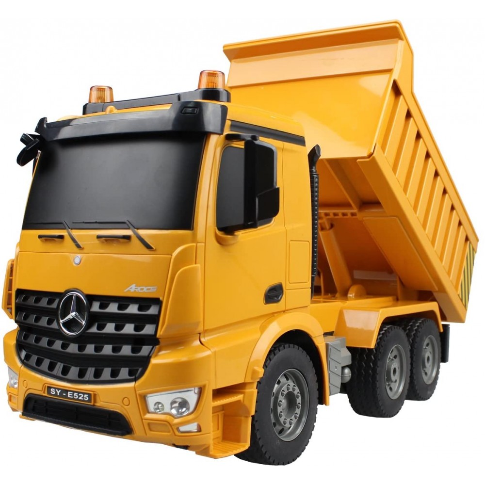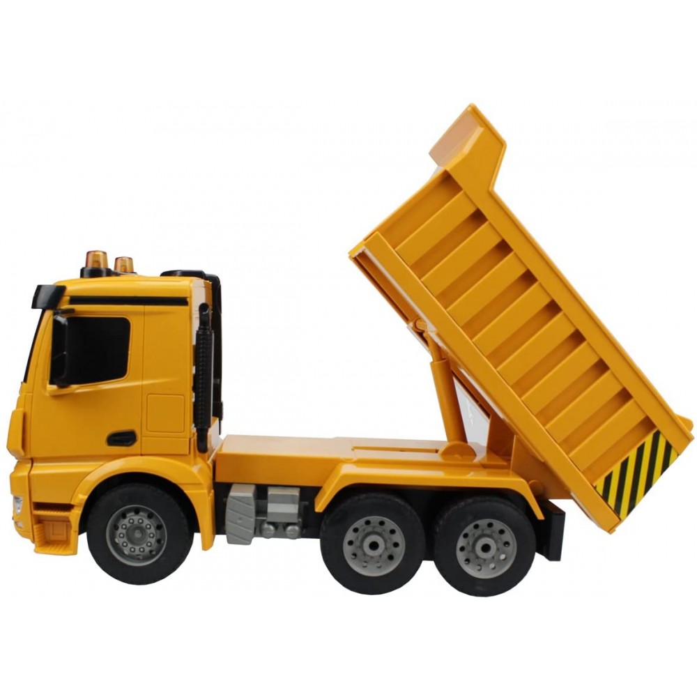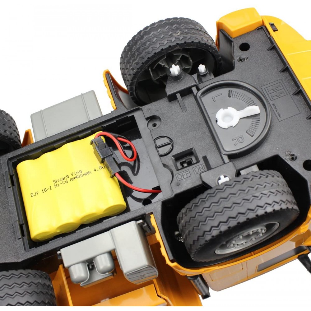- 4 ruedas de tracción 6 canales. Totalmente funcional: adelante, atrás, izquierda, derecha, cama de descarga arriba y abajo. Luces LED y sonidos de simulación: faros, traseros, luces superiores.