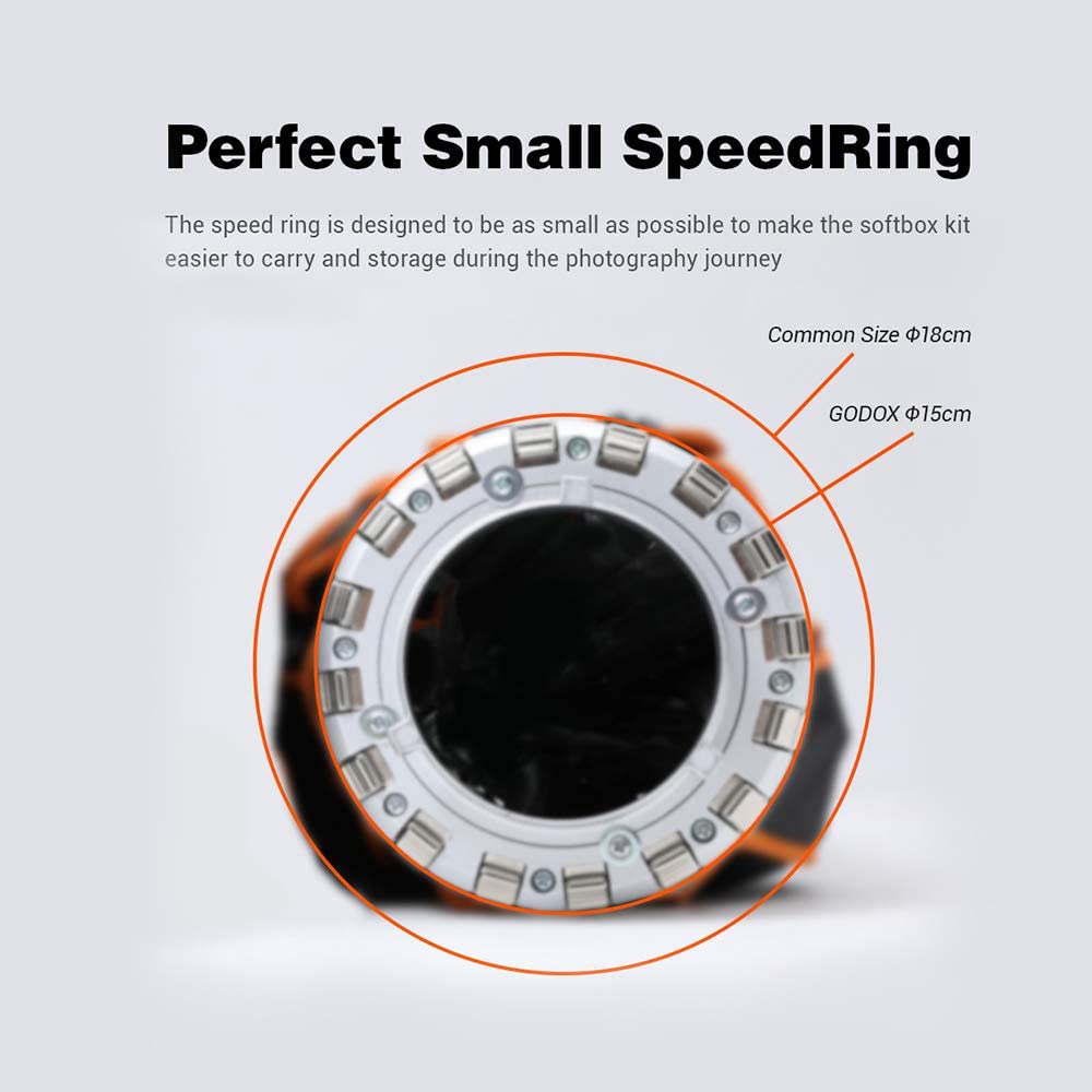 - Anillo de velocidad pequeña para un fácil transporte: diámetro común: tamaño 7.1 in frente a diámetro Godox, tamaño 5.9 in. El anillo de velocidad está diseñado para ser lo más pequeño posible para hacer que el kit de softbox sea más fácil de transportar y almacenar