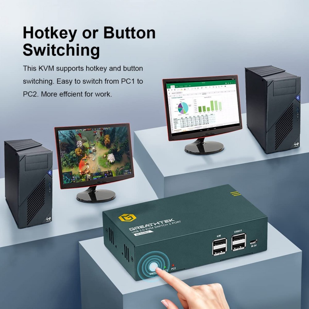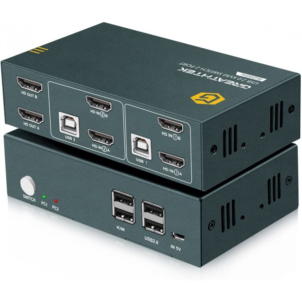 GREATHTEK KVM Switch HDMI Dual Monitor 2 Puertos, 4K 60Hz UHD Resolución YUV, 4 Hub USB 2.0 Soporta dispositivos USB 2.0