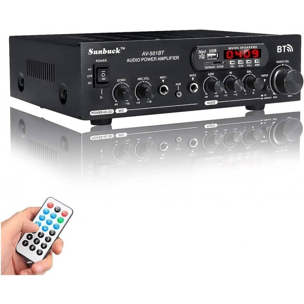 Sunbucks amplificador de audio estéreo para el hogar, 100W RMS, 110/220V, con bluetooth, doble canal, entrada de micrófono Karaoke