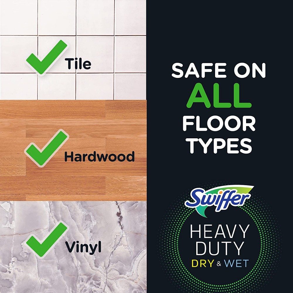 - Seguro en todos los tipos de suelo, por lo que se puede utilizar en azulejos, madera dura y suelos de vinilo. Nota: No utilices paños de trapeador húmedos Swiffer Sweeper en tableros de madera sin acabar, engrasados o encerados, azulejos no sellados o suelos alfombrados porque pueden ser sensibles al agua