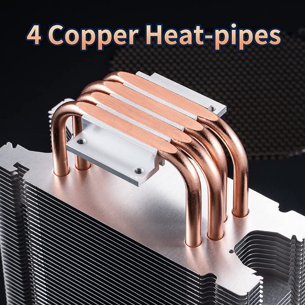 - 4 tubos de calor de cobre: 4 tubos de calor de cobre puro de 0.236 in y vacío de este ventilador de refrigeración para CPU se pueden conectar directamente a la CPU. Por lo tanto, el calor se puede transferir rápidamente a las aletas sin ningún obstáculo. Y adopta la tecnología de penetración de aletas y hebilla de aleta, los tubos de calor y las aletas se pueden conectar estrechamente, el sistema de conducción de calor es fácil de trabajar.