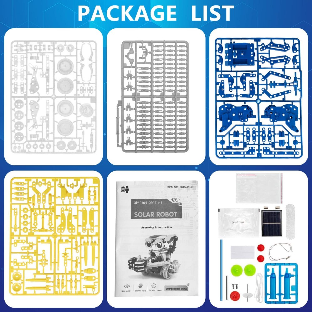 - Juguetes robot educativos y divertidos: como un gran kit de experimentos científicos de construcción de bricolaje, este juguete robot solar 11 en 1 es un juguete educativo perfecto para los amantes del bricolaje. Adecuado para el hogar, al aire libre, partes de un proyecto de ciencia en la escuela, actividades de tallo, juegos educativos preescolares, reuniones familiares y otras ocasiones. Los niños pueden montar varios robots con sus padres o amigos. No solo cultivará sus habilidades de trabajo en equipo, sino que también puede experimentar una sensación de logro, sentir felicidad infinita.