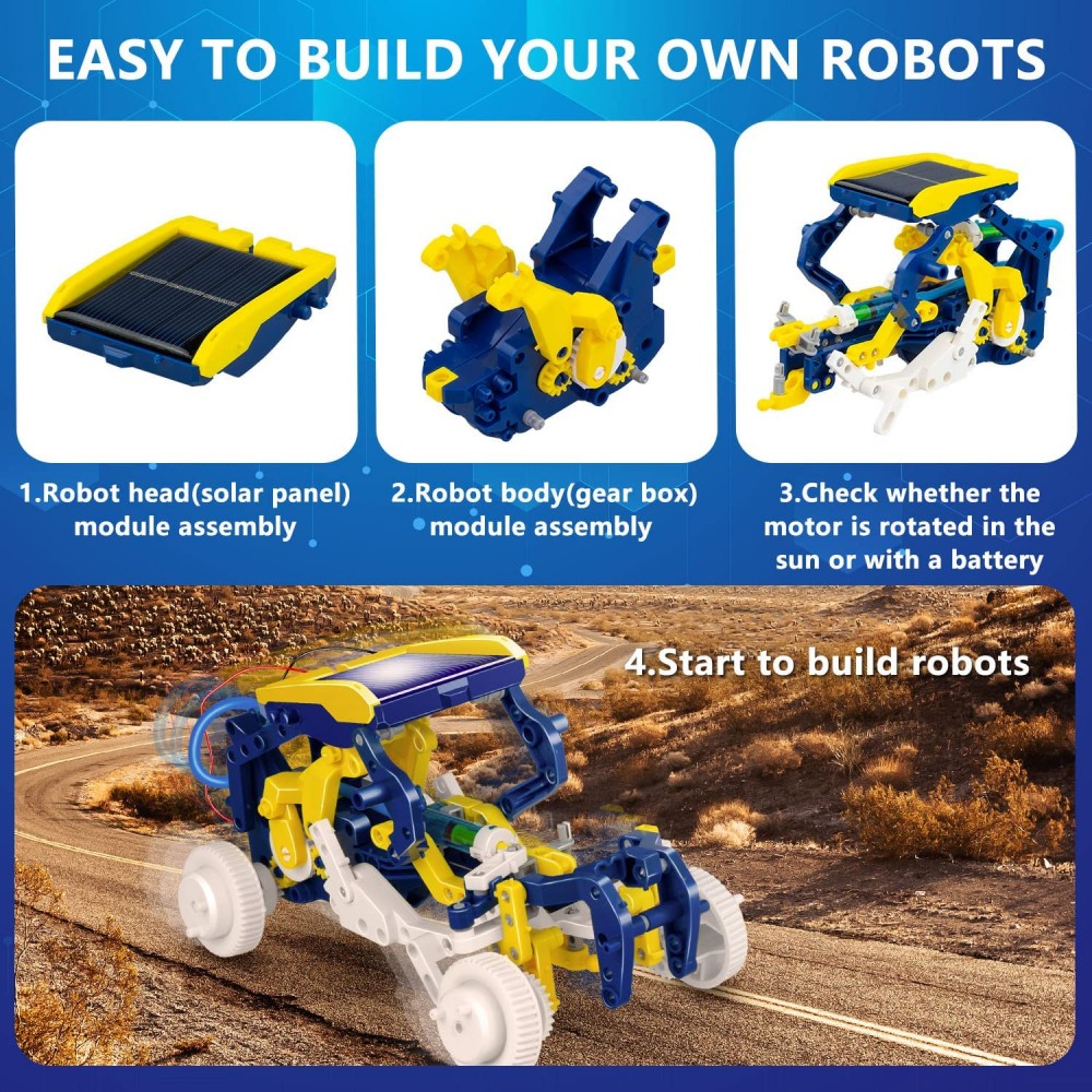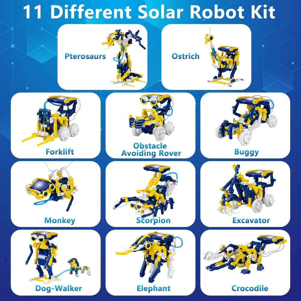 - Kits de juguetes de robot solar educativo 11 en 1: los kits de robot solar STEM 11 en 1 para niños de 8 a 12 años se pueden construir 11 formas diferentes de robots que se pueden mover en tierra, incluyendo 4 modelos de vehículos y 7 modelos de animales: Rover, Buggy, Excavadora, Carretilla elevadora, Elefante, Cocodrilo, Pterosaurios, Dog-Walker, Mono, Avestruz, Mono, Escorpión. Los niños pueden elegir la forma que les gusta y utilizar su imaginación infinita para construir y crear sus propios juguetes robot de tallo.