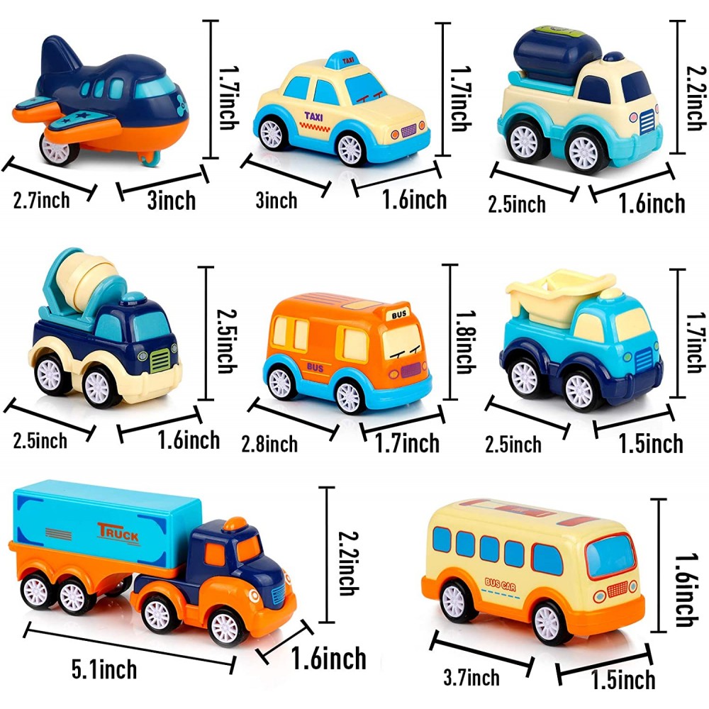 - Este juego de coche de juguete tiene 9 tipos diferentes de vehículos de colores brillantes, incluyendo un avión, un camión volquete, un camión mezclador, un taxi, un autobús escolar, un autobús urbano, un camión de transporte y un aspersor. Algunos de los vehículos tienen piezas extraíbles para aumentar la diversión.