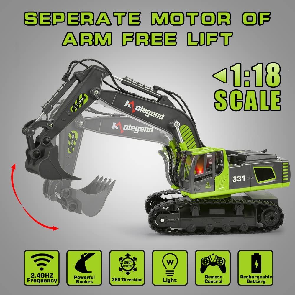 kolegend Excavadora de control remoto, juguete a escala 1.18, excavadora hidráulica, para niños y niñas, tractor RC con luces recargable