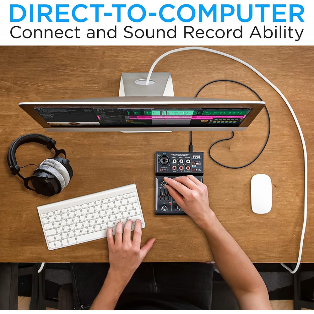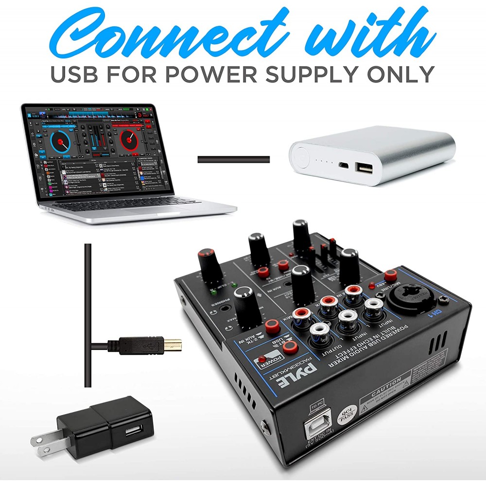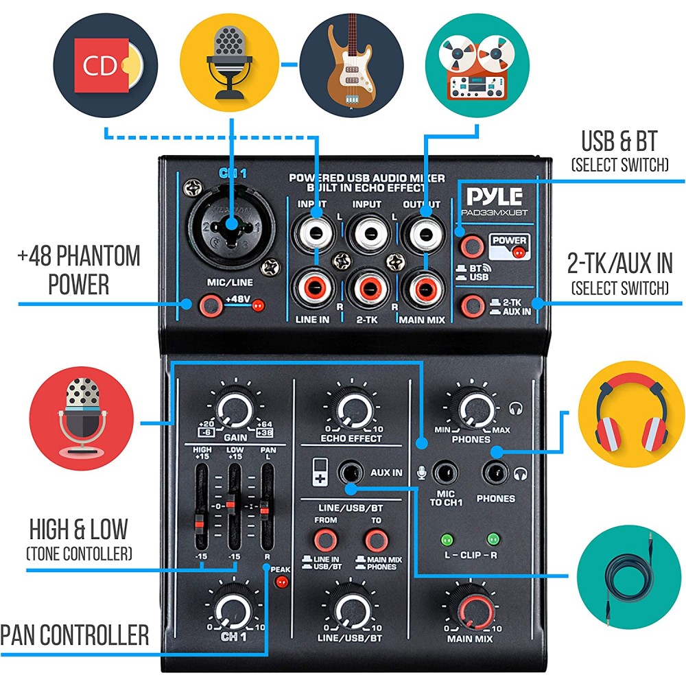 - 5 entradas: el mezclador de interfaz de audio USB Pyle DJ está equipado con conector combinado XLR + 0.250 in para entradas de micrófono/línea/guitarra, 2-TK, entrada RCA estéreo, AUX y entrada de micrófono de 0.138 in a CH1. Produce una mezcla creativa que es perfecta para fiestas de DJ/grabación de música