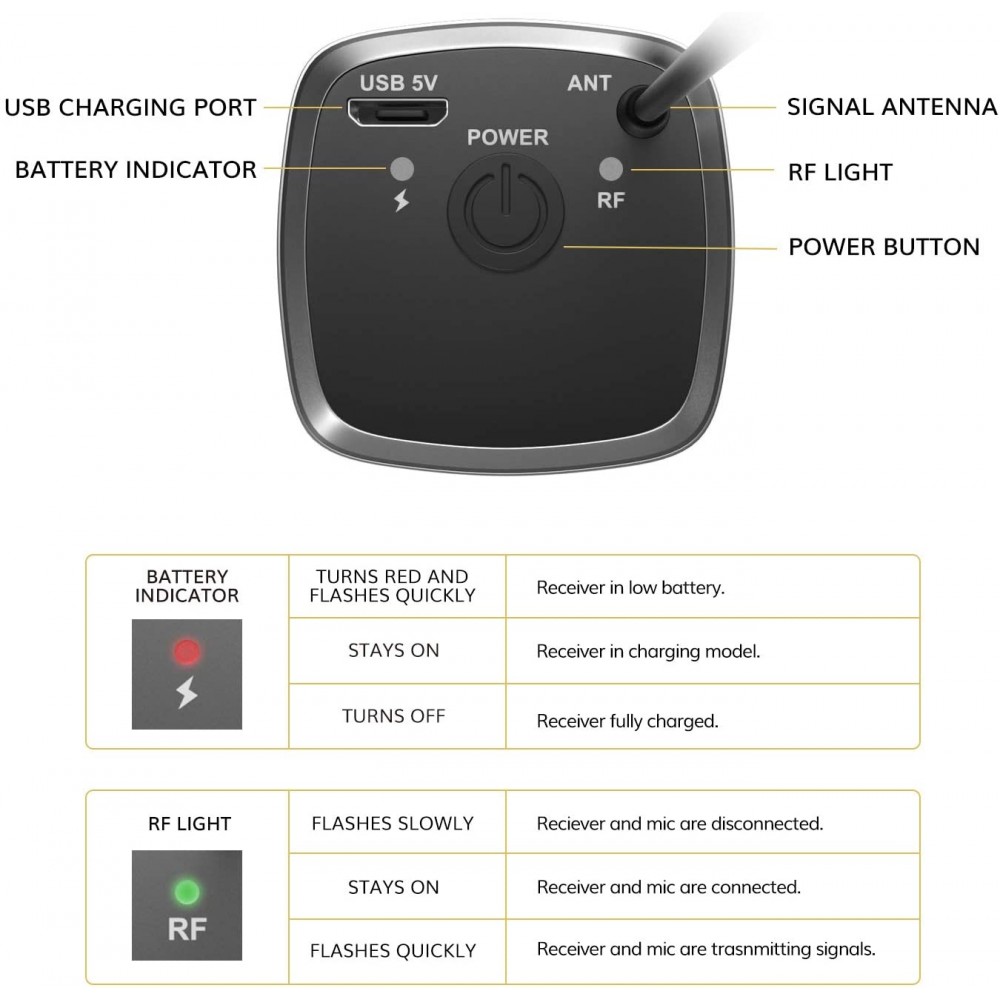 - Batería recargable: el receptor recargable y portátil solo necesita cargar durante aproximadamente 2-3 horas y se puede utilizar hasta 6 horas. Tanto el micrófono como el receptor están hechos de metal resistente, que tiene una fuerte resistencia al impacto y a la corrosión.