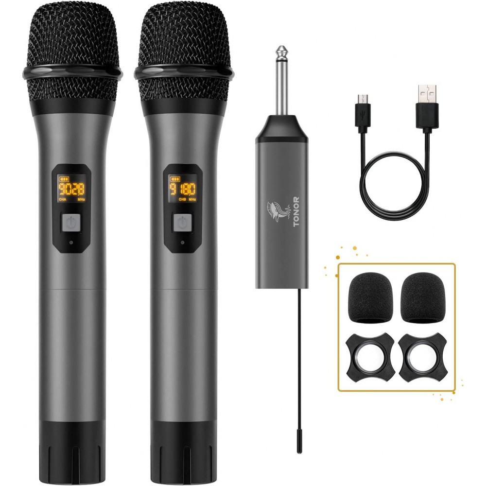 Micrófono inalámbrico, sistema de micrófono dinámico de metal inalámbrico dual TONOR UHF con receptor recargable, para karaoke 200 pies