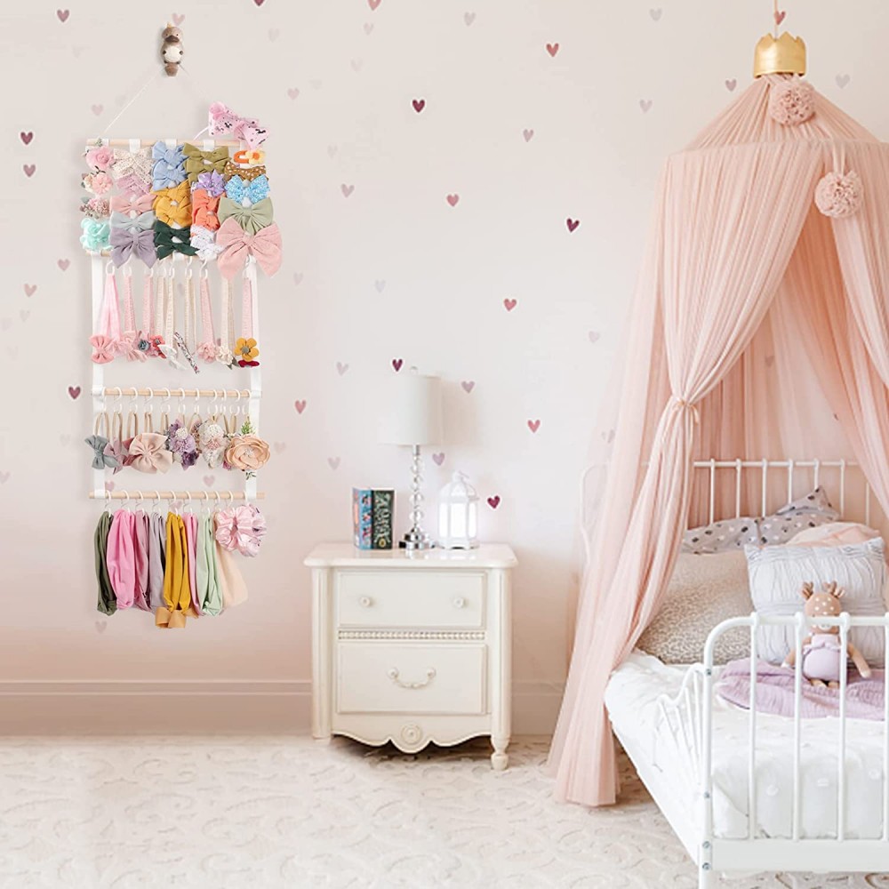 - Gran capacidad de ahorro: (lazos y diademas no incluidos) Tamaño: 30.7 x 13.6 in. Diseñado con 1 fila organizador de lazos para el cabello para niñas que puede contener hasta 40 pinzas pequeñas para el pelo, 3 filas de diademas con 30 ganchos que pueden contener hasta 60 diademas para el cabello. Organiza todos los accesorios para el cabello del bebé en una sola lugar fácil!