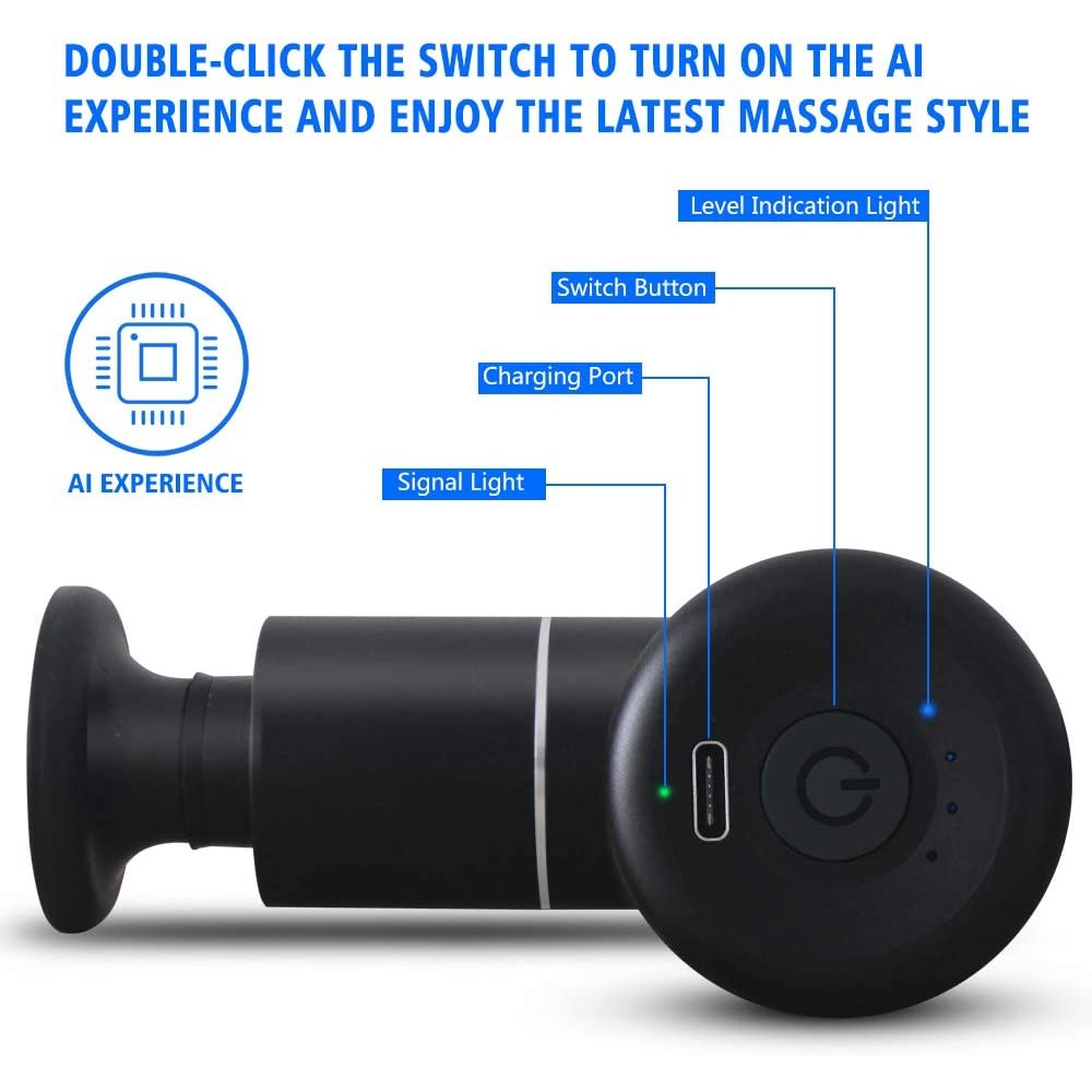 - Experiencia AI y modo seguro: la frecuencia se puede ajustar de acuerdo a la fuerza ejercida en la mano, cuanto mayor sea la fuerza, mayor será la frecuencia. PS: cuando la potencia es demasiado fuerte, las mini pistolas de masaje se detendrán automáticamente para protegerte