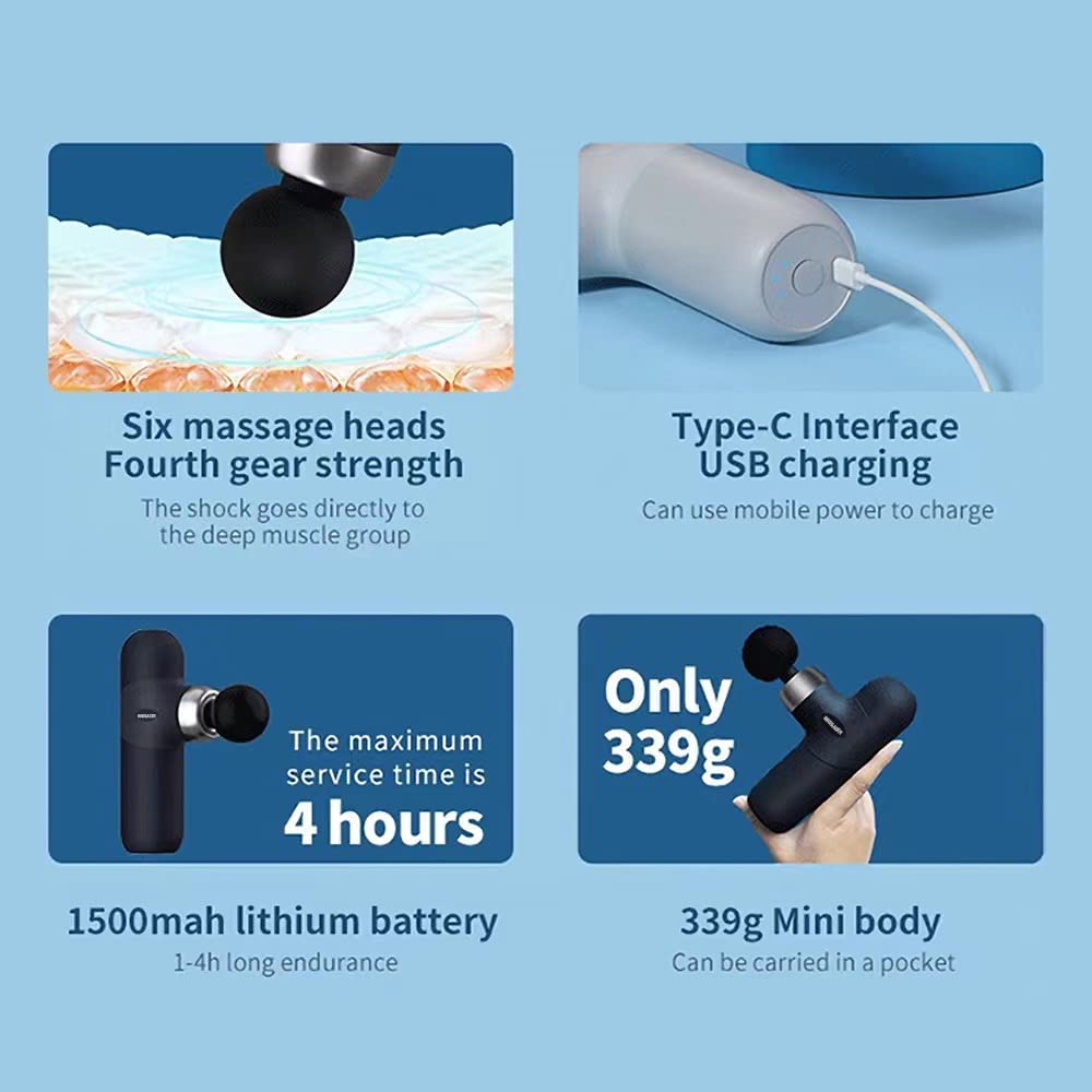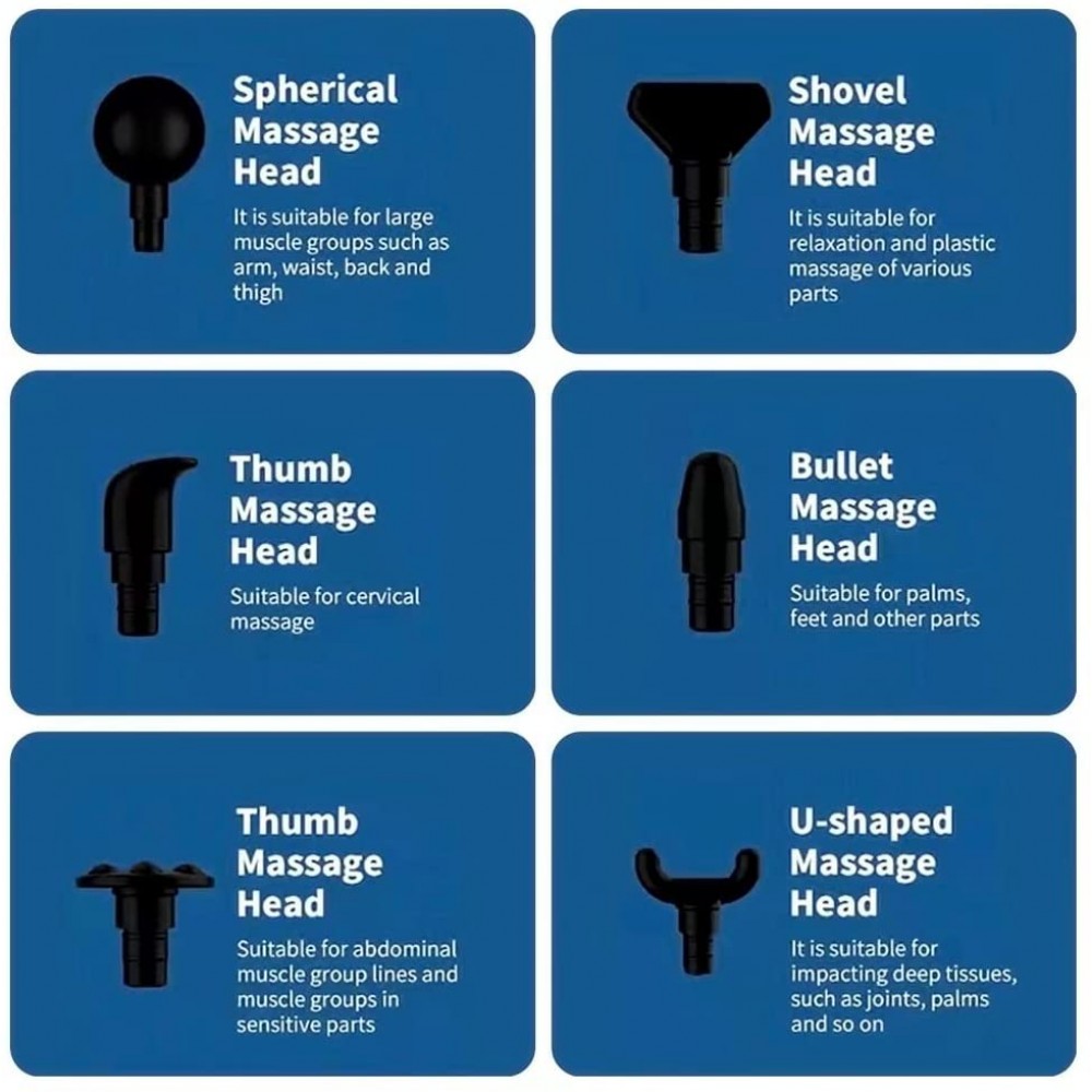 - La pistola de fascia tiene 6 cabezales de masaje y 4 velocidades. Te permite tocar cada músculo profundo y se puede utilizar para masaje de cuerpo completo, cuello, hombros, espalda, piernas, manos, masaje de cintura.