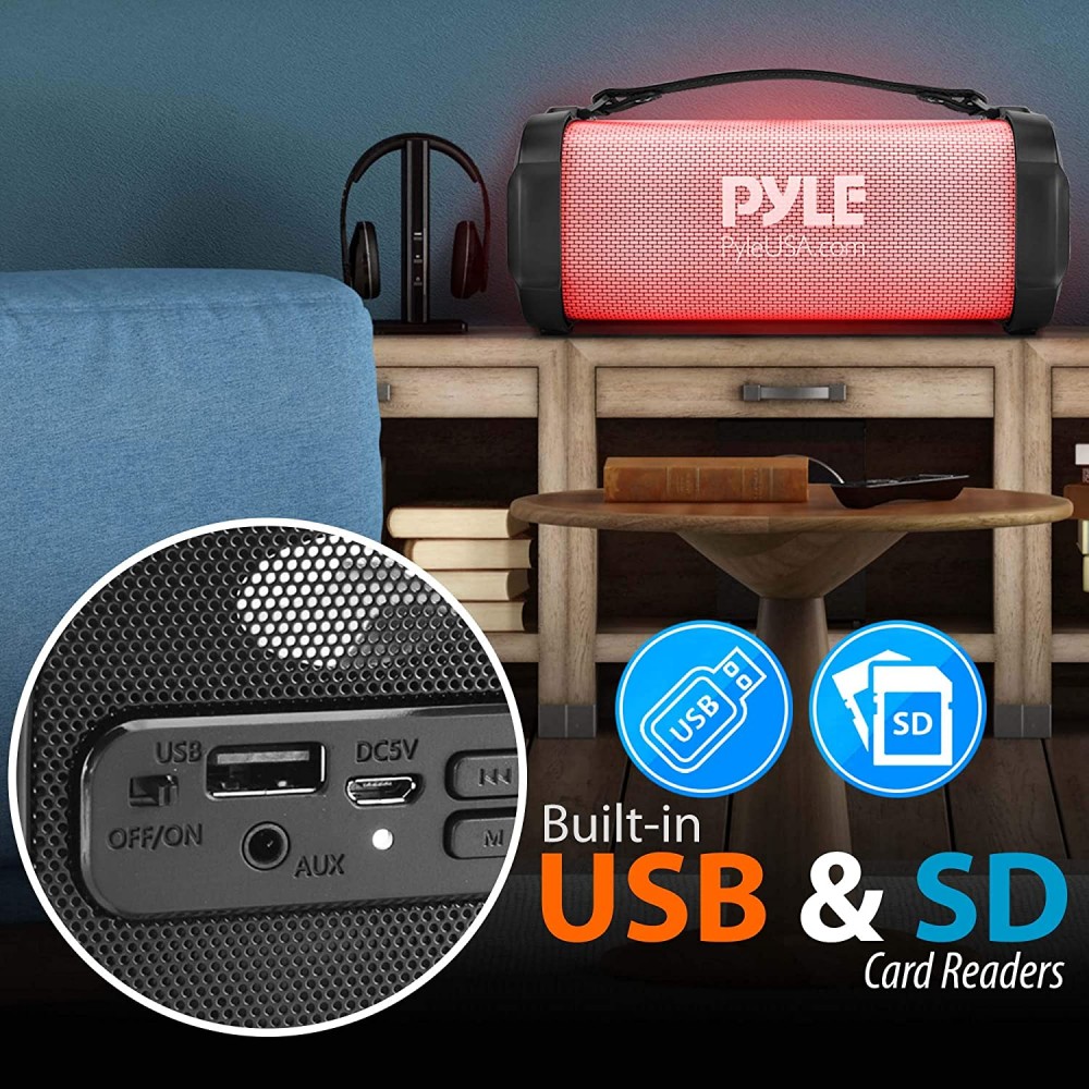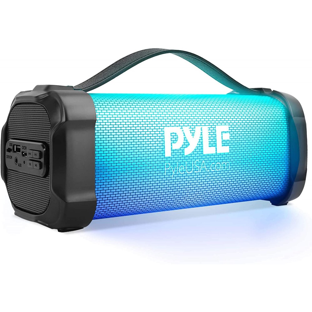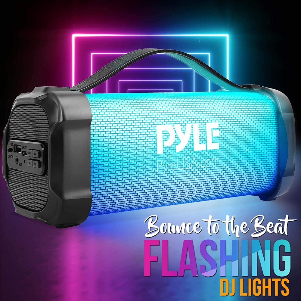 - Luces intermitentes de DJ: Este altavoz Bluetooth de barril con sistema de radio Pyle FM Boombox con Bluetooth cuenta con un panel de control lateral para una fácil configuración de audio y luces intermitentes RGB DJ que son ideales para fiestas/añade un poco de pasión por la noche