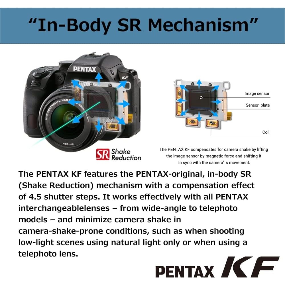 - El mecanismo SR (reducción de vibraciones) en el cuerpo con un efecto de compensación de 4.5 pasos de obturación funciona eficazmente con todas las lentes intercambiables PENTAX