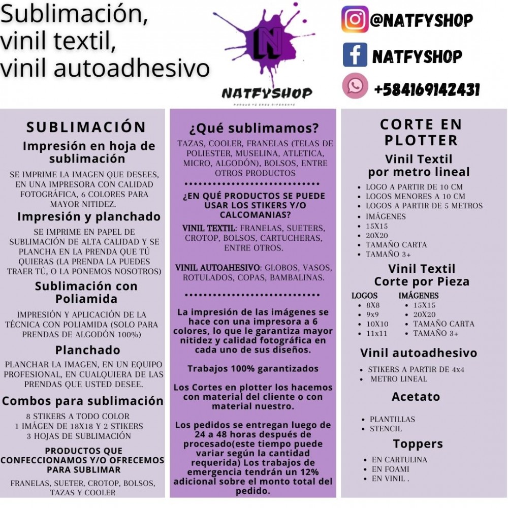 - Modelo: Servicios de sublimación, vinil textil y vinil autoadhesivo