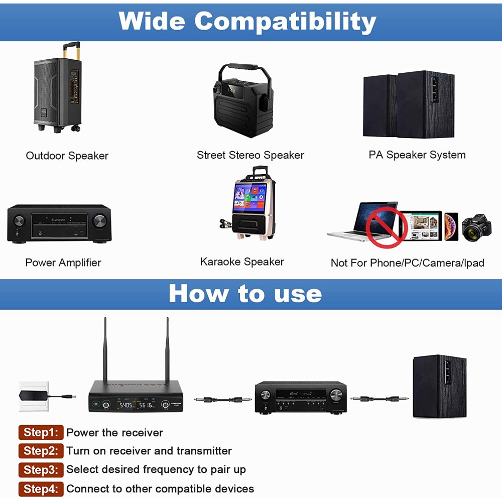 - 30 frecuencias ajustables: el circuito de última generación diseña grupos de frecuencia ajustables de 2 x 30 para este juego de microfono inalambrico en banda de 500 MHz, lo que permite que hasta 30 unidades se utilicen al mismo tiempo sin interferencias. También puedes disfrutar de la libertad de cambiar la frecuencia si la frecuencia preestablecida falla. La distancia de funcionamiento es de hasta 200 pies en línea de visión de espacio abierto
