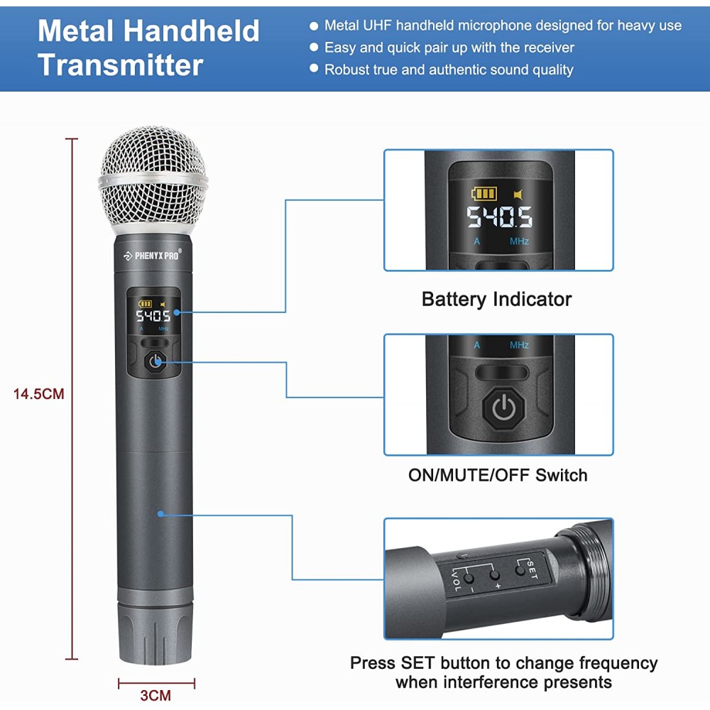 Phenyx Pro - Sistema de micrófono inalámbrico de metal, micrófonos dinámicos inalámbricosDJ, rango de 200 pies