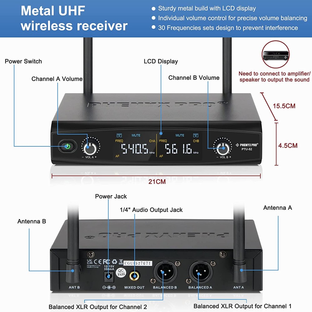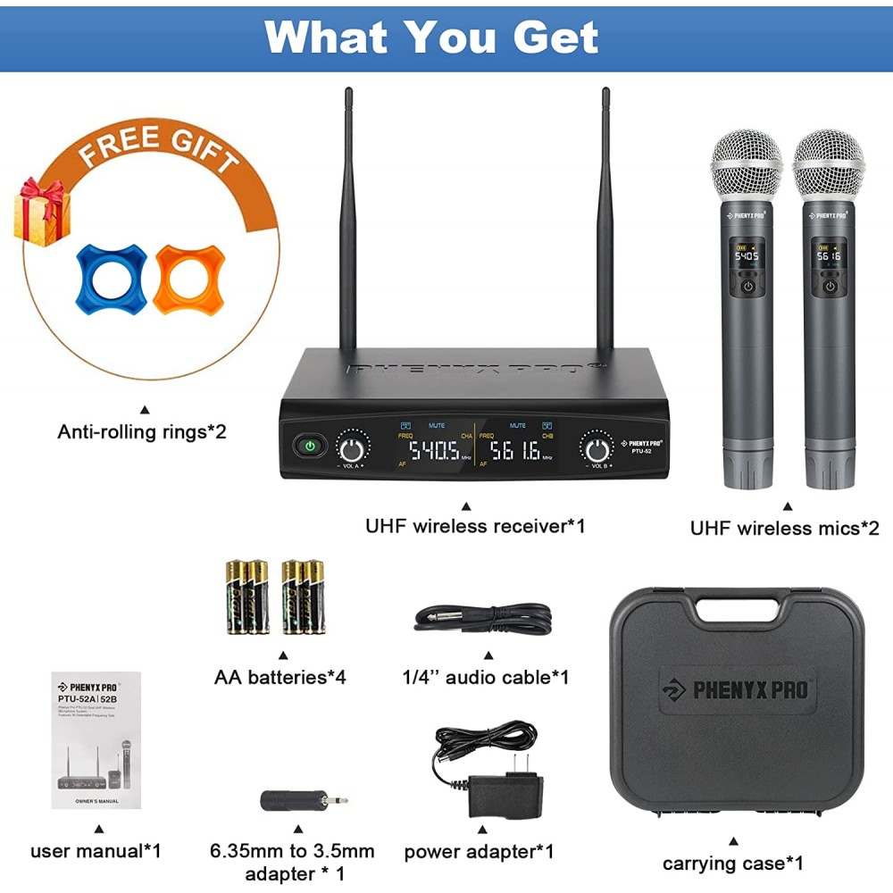 - Contenido de la caja: 1 funda de transporte, 1 receptor inalámbrico UHF, 2 micrófonos inalámbricos UHF, 1 adaptador de corriente, 1 cable de audio de 1/4 pulgadas, 1 adaptador de 0.250 in a 0.138 in, 4 pilas AA, 1 manual de usuario (idioma español no garantizado), 2 anillos antivuelco