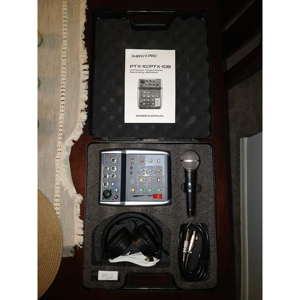 Phenyx Pro Paquete de mezclador de audio con interfaz de audio USB, 4 entradas, ecualizador de 3 bandas, efectos de eco, con micrófono dinámico