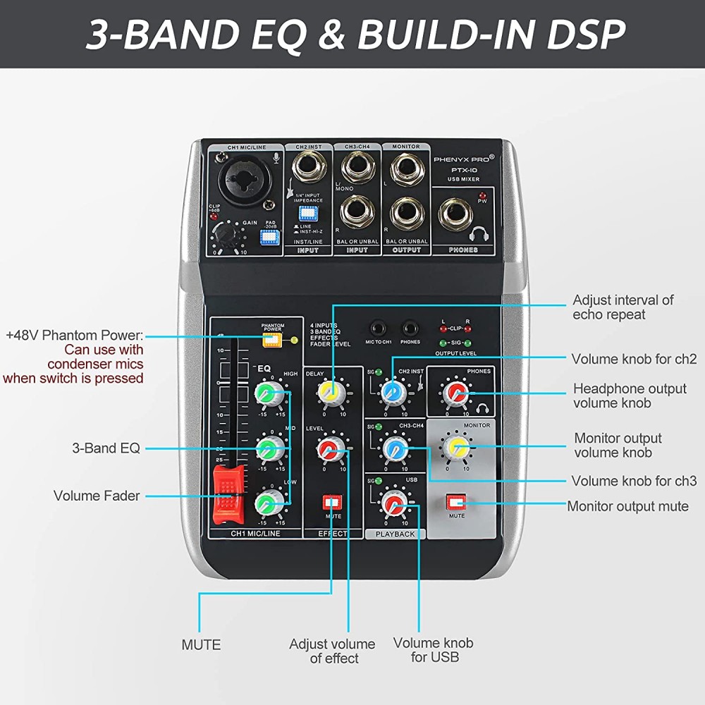 - 4 entradas y ecualizador de 3 bandas: este preamplificador de audio de ruido ultra bajo premium tiene 4 entradas. Cuenta con control de ecualizador ultra musical de 3 bandas y un interruptor de alimentación Phantom de +48 V en Ch. 1. Permite un ajuste fácil y preciso de la mezcla de música personal. Ch.1 tiene entradas combo de micrófono/instrumento
