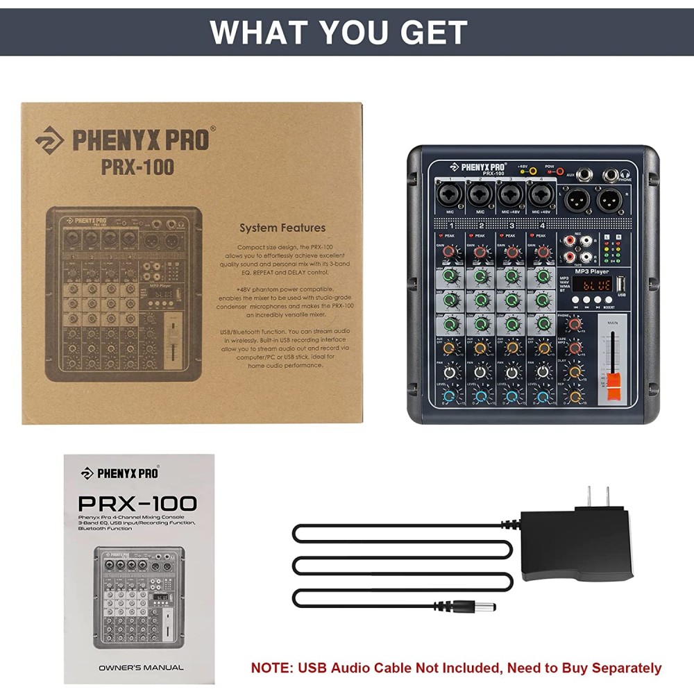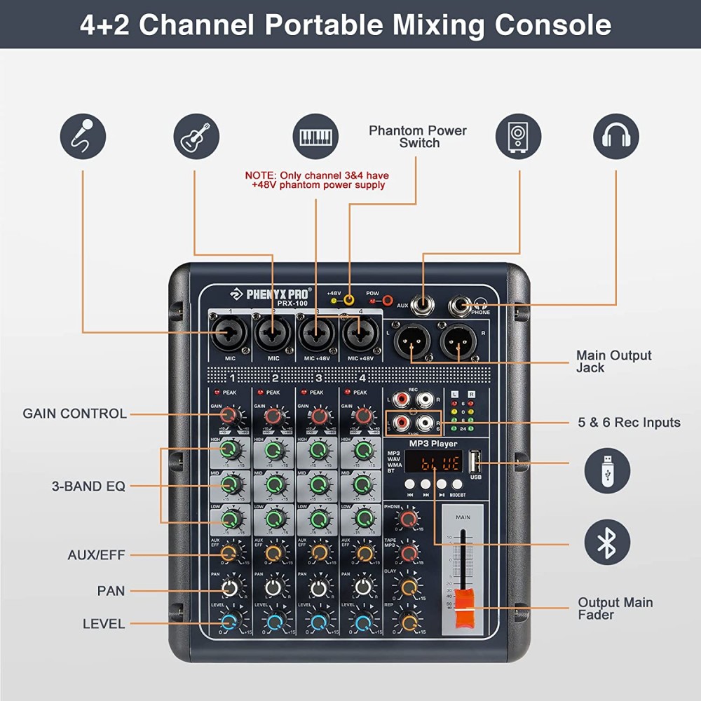 Phenyx Pro PRX-100 Mezclador de audio, 4 mas 2 canales consola de mezcla con ecualizador de 3 bandas, USB, Bluetooth