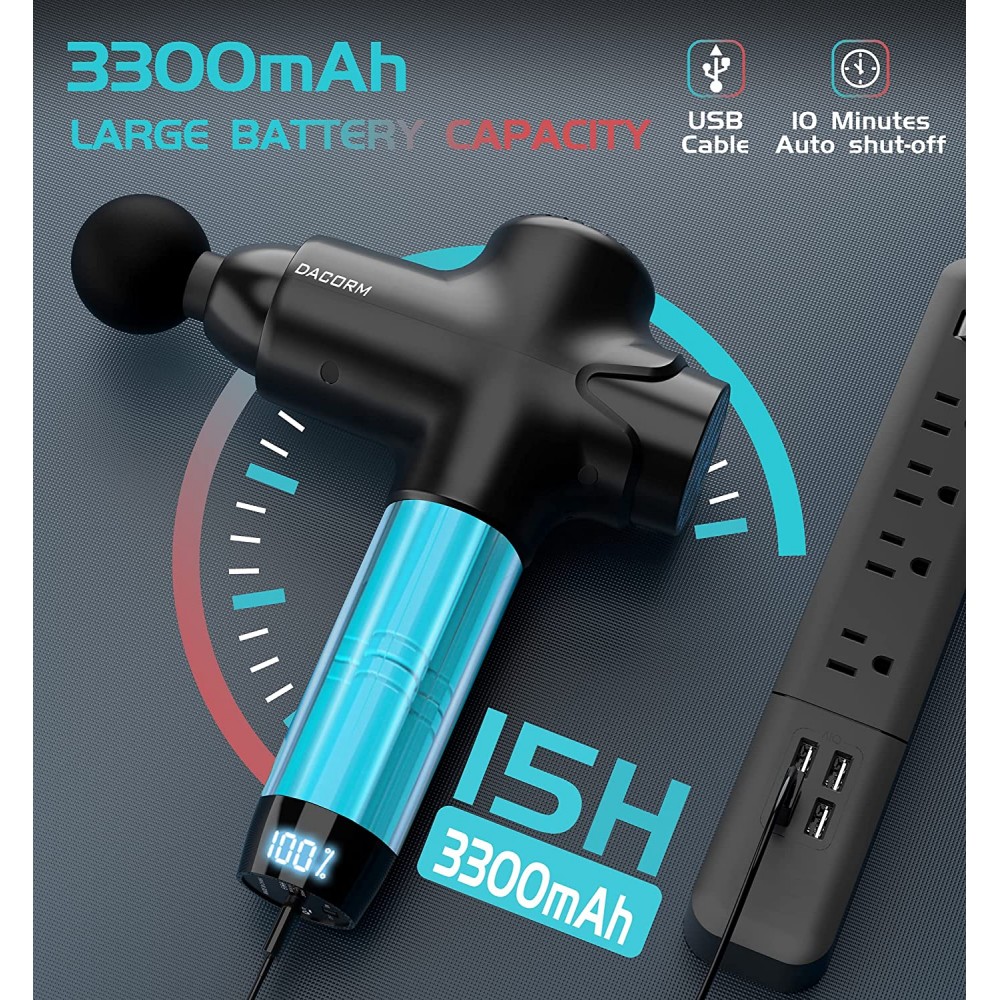- Pistola de masaje, equipada con una batería de litio de 3300 mAh, dura de 8 a 15 horas de uso de masaje con una sola carga. Viene con un cable de carga USB (enchufe de cambio no incluido), adecuado para todos los puertos de carga.