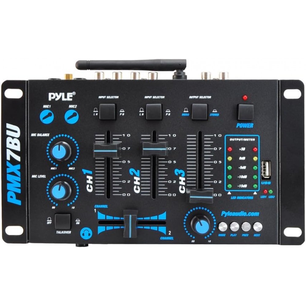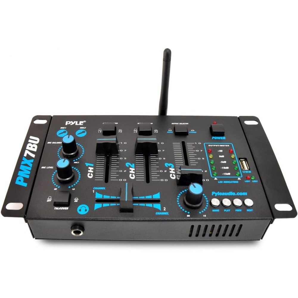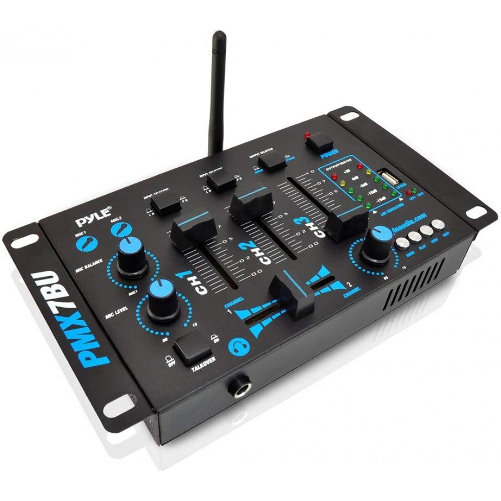 Pyle - Pro Mezclador de audio inalámbrico para DJ, 3 canales, compatible con Bluetooth, controlador de DJ, mezclador de sonido, micrófono PMX7BU.5