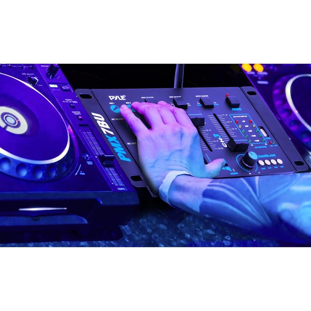 5 ENTRAS: El mezclador Pyle está equipado con línea de audio RCA de doble fono, micrófono TRS equilibrado de 2 1/4 pulgadas y un lector de unidad flash USB. También tiene un conector para auriculares de ¼". Produce remixes altamente creativos que son perfectos para fiestas de DJ/grabación de música