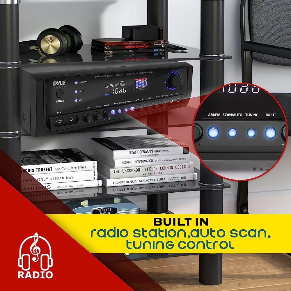 Pyle Sistema amplificador de potencia de audio para el hogar, 300 W, 4 canales, con USB, RCA, AUX, micrófono con eco