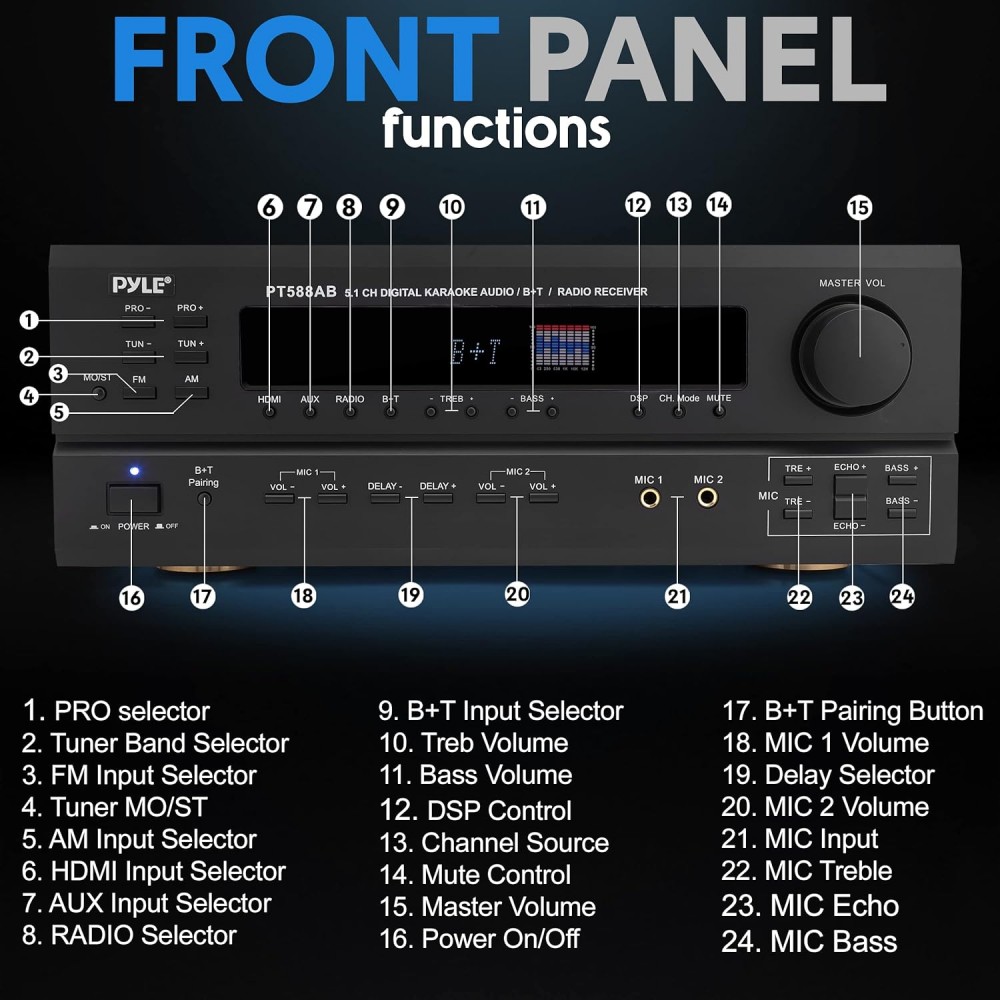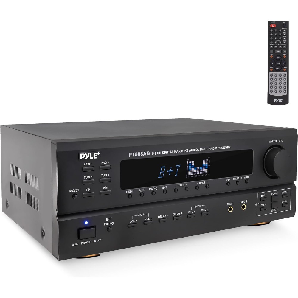 - Potencia de 420 vatios: el receptor estéreo digital Pyle de 5.1 canales es perfecto para tu sistema de entretenimiento de karaoke, cine en casa. Te da un pico de 420 W para ser utilizado para múltiples altavoces con impedancia de 4 ohmios que te permite disfrutar de audio amplificado de alta calidad