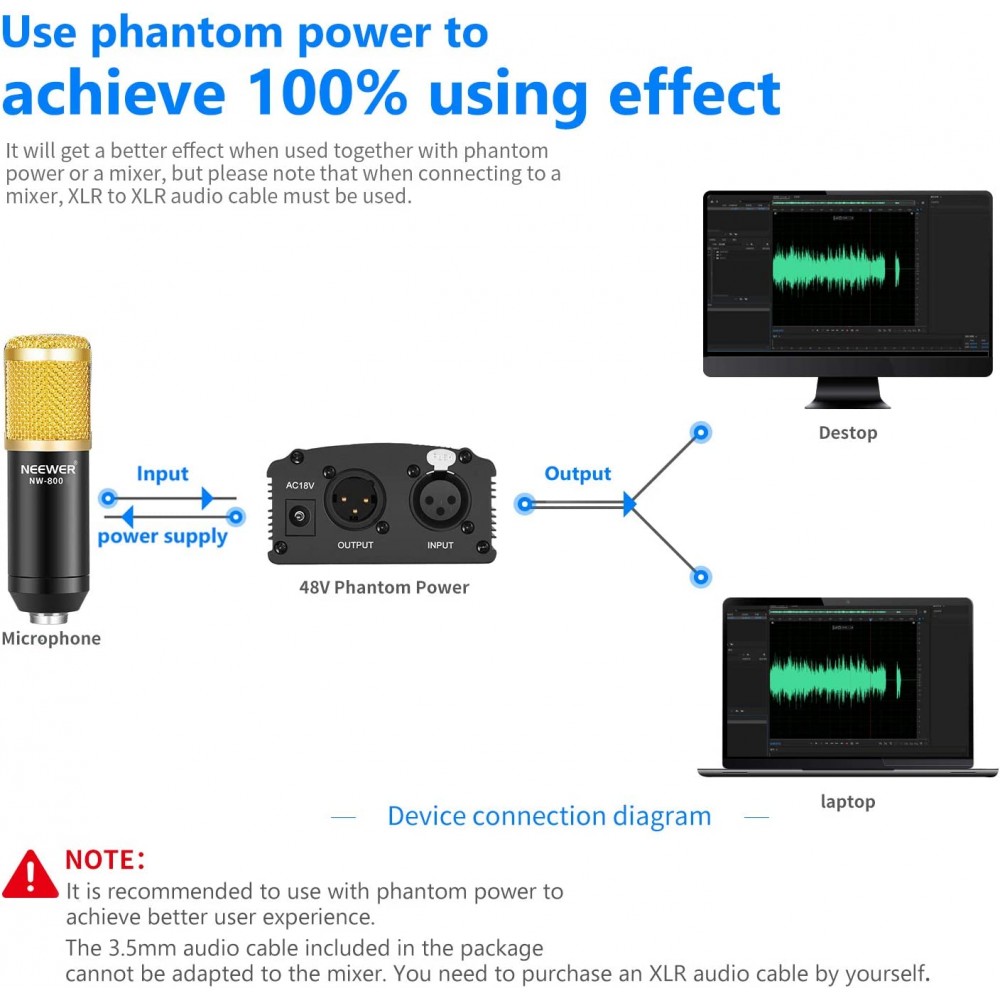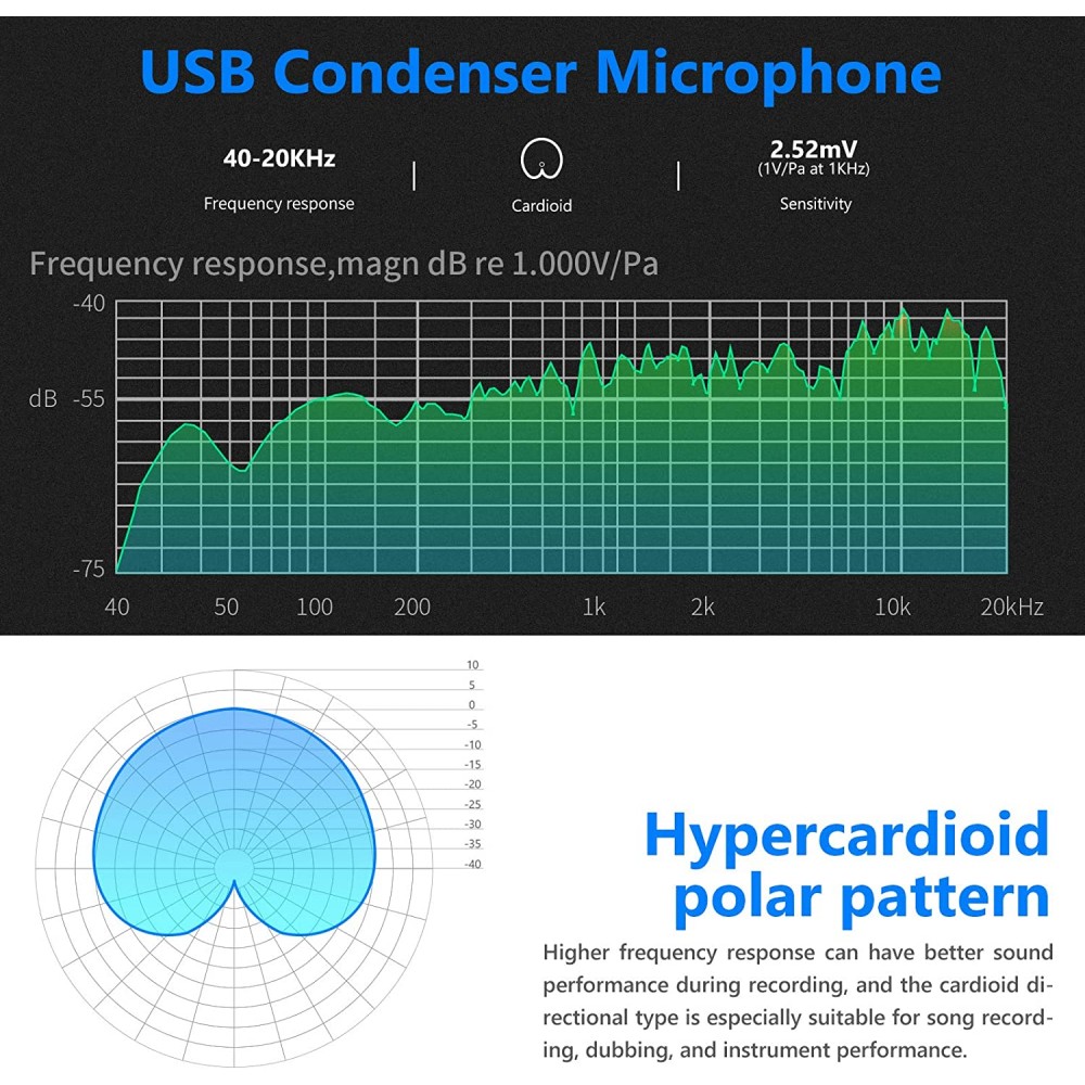 - El micrófono de condensador profesional adopta el riguroso control completo del circuito electrónico. Captura el delicioso sonido con cuerpo de las fuentes de sonido que están directamente en frente del micrófono.
