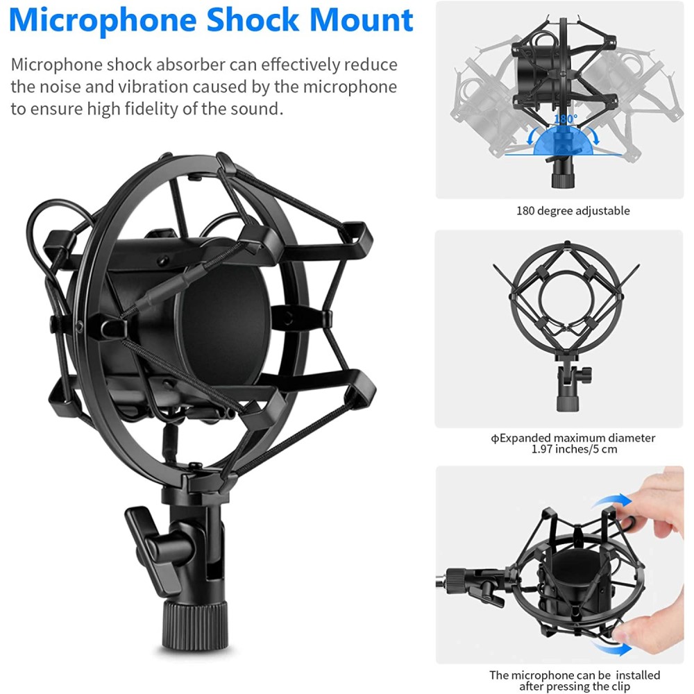 - El conjunto incluye: (1) micrófono de condensador profesional negro + (1) soporte de micrófono + (1) tapón de espuma antiviento tipo bola + (1) cable de micrófono.