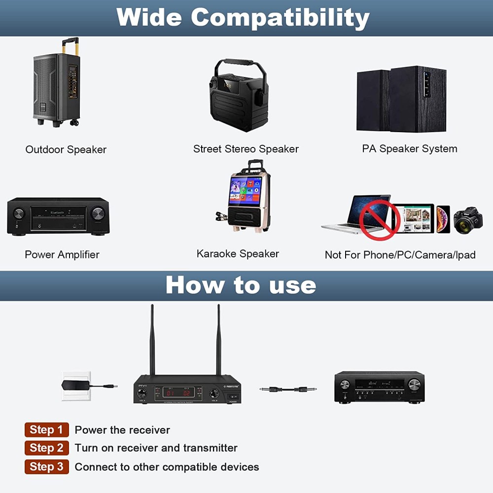 - Más flexibilidad: fácil configuración con una salida XLR y una salida mixta de 1/4 pulgadas. El paquete incluye un adaptador de 1/4 a 1/8 pulgadas para que las personas lo utilicen con un pequeño altavoz y dispositivos que tienen un conector de entrada de audio de 1/8 pulgadas. Los sistemas deben estar integrados con un amplificador/altavoz para emitir el sonido. Este sistema inalámbrico está diseñado en diferentes grupos de frecuencia y más de un sistema puede funcionar al mismo tiempo. Ponte en contacto con el fabricante para obtener ayuda