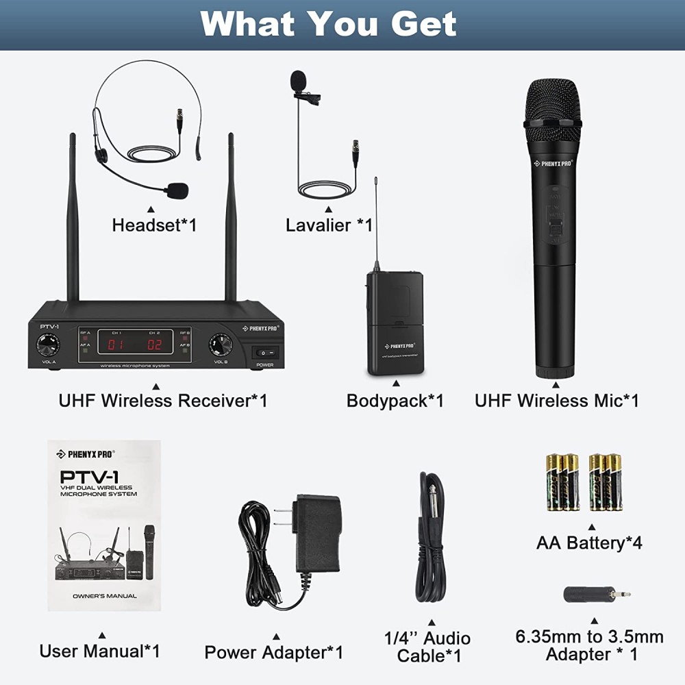 - Contenido de la caja: receptor inalámbrico VHF con salidas XLR y 1/4 pulgadas para largo alcance, 1 micrófono de mano, 1 micrófono de auriculares, 1 micrófono de solapa, 1 bodypack, cable de audio de 1/4 pulgadas, adaptador de corriente CA/CC, adaptador de cable de 6.5 a 0.138 in, manual de usuario, 4 baterías AA para uso de larga hora (hasta 16 horas de funcionamiento)