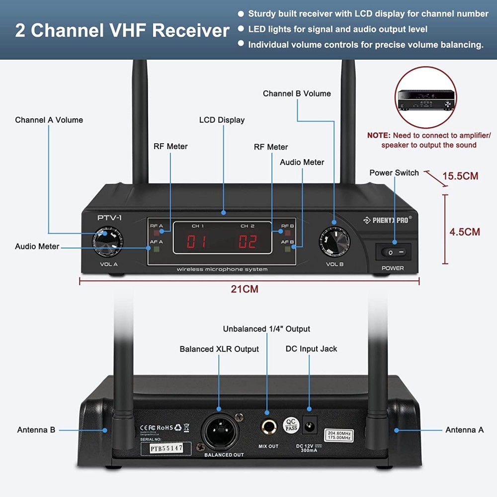 - Rendimiento inalámbrico suave: sistema de micrófono inalámbrico VHF de dos canales, bien diseñado para un rendimiento sin interferencias y transmisión de sonido sin complicaciones. Sincronización inalámbrica rápida y fluida para la configuración plug-and-go. La pantalla LCD fácil de leer muestra el número de canal, la luz LED muestra la señal y el nivel de salida de audio, visualizando el estado del sistema para una monitorización conveniente. La distancia de funcionamiento es de 130-150 pies en espacio abierto, línea de visión