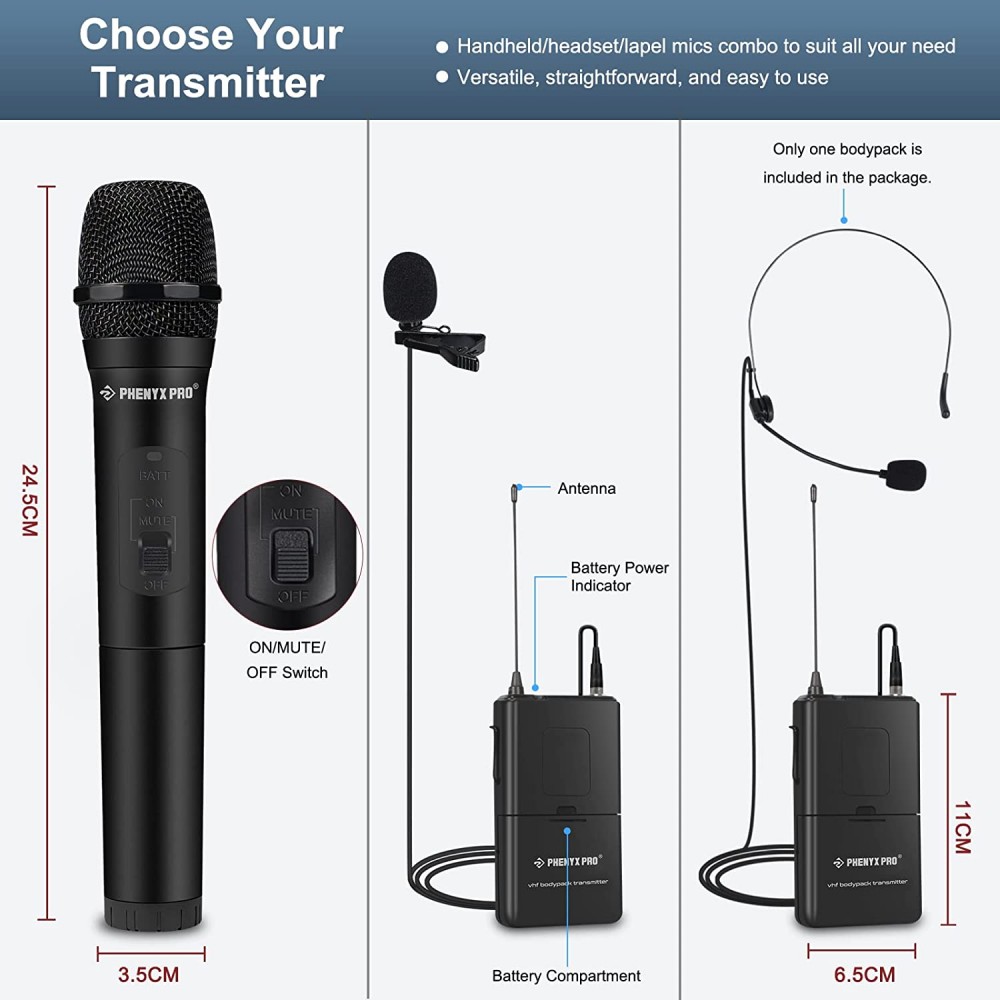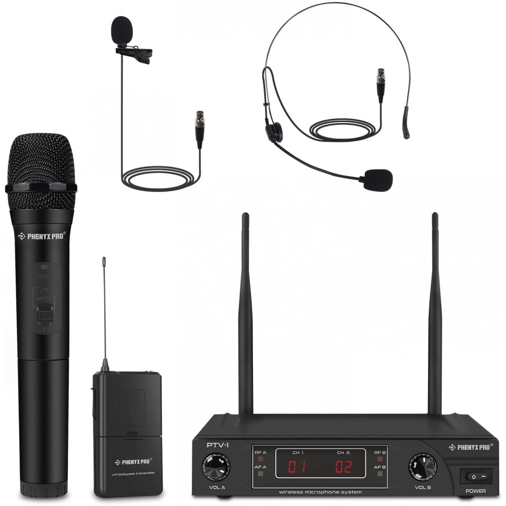 Sistema de micrófono inalámbrico, Phenyx Pro VHF inalámbrico con 1 mano, 1 auricular, 1 solapa , 1 mochila, señal estable, largo alcance.