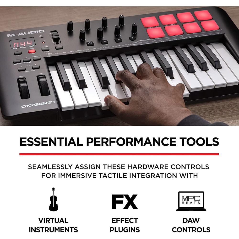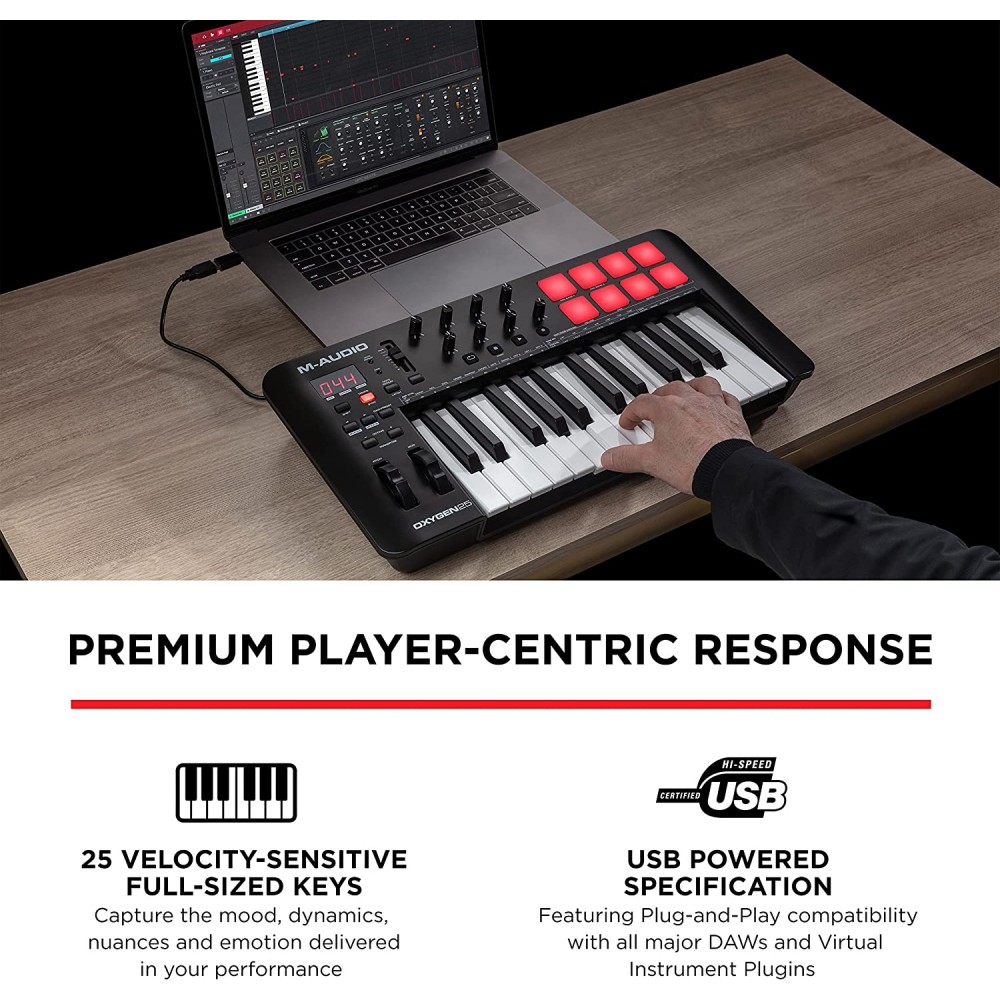 - Equipo esencial de estudio de grabación: controlador MIDI con 25 teclas de estilo piano de tamaño completo sensibles a la velocidad que ofrece una respuesta natural que obtiene lo mejor de los enchufes de muestras y sintetizadores virtuales