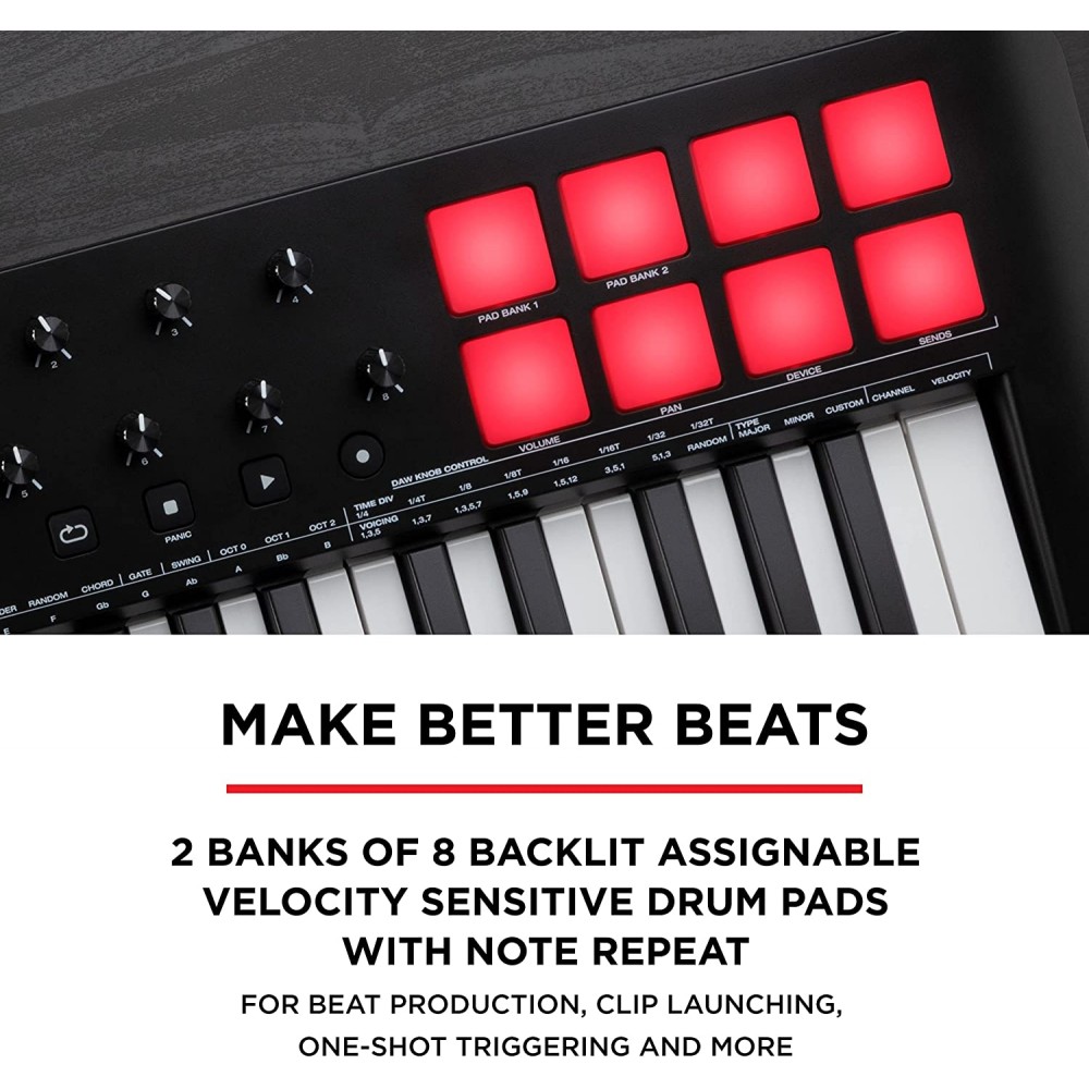 - Cada herramienta que necesitas: auto-mapeo sin esfuerzo para controles DAW y parámetros de enchufe; modos Smart Chord y escala inteligente; Arpeggiator; ruedas de tono y mod; entrada de pedal de sostenido; cable USB MIDI incluido