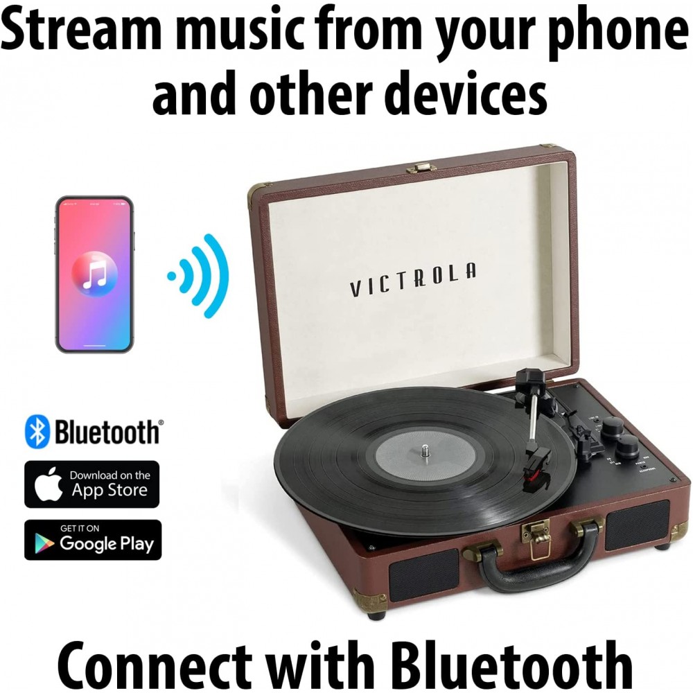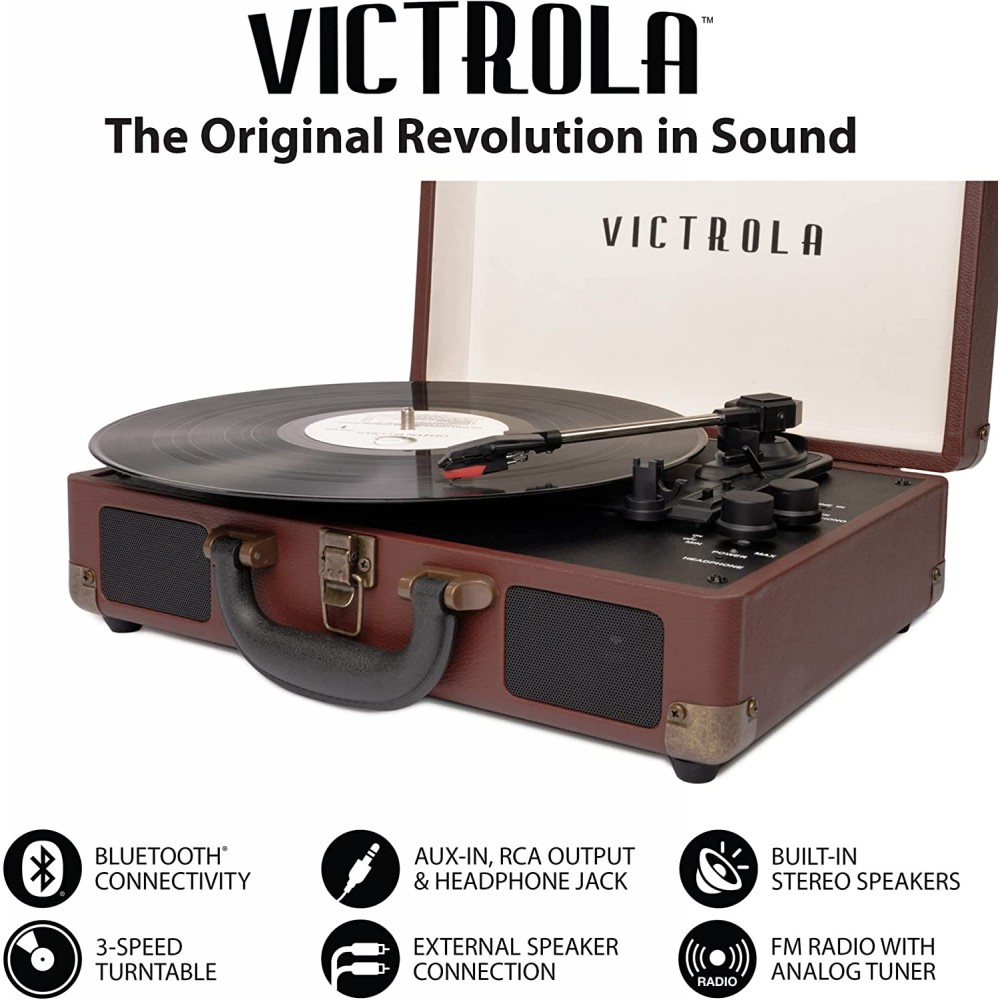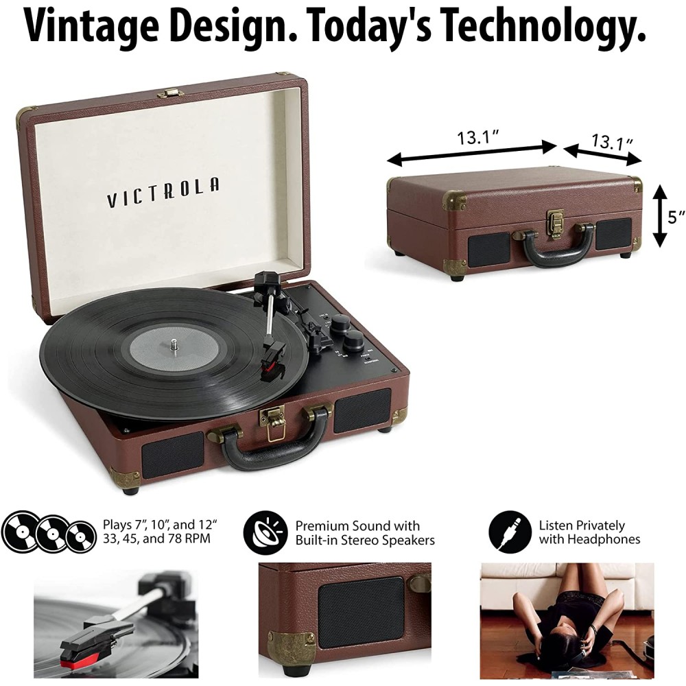 - Lleva tus tonos a cualquier lugar: alojado en una maleta vintage con un asa de fácil transporte, la mezcla de Victrola de diseño retro y contemporáneo te da la máxima flexibilidad para escuchar música donde quieras y cómo quieras, una gran opción para los amantes del vinilo