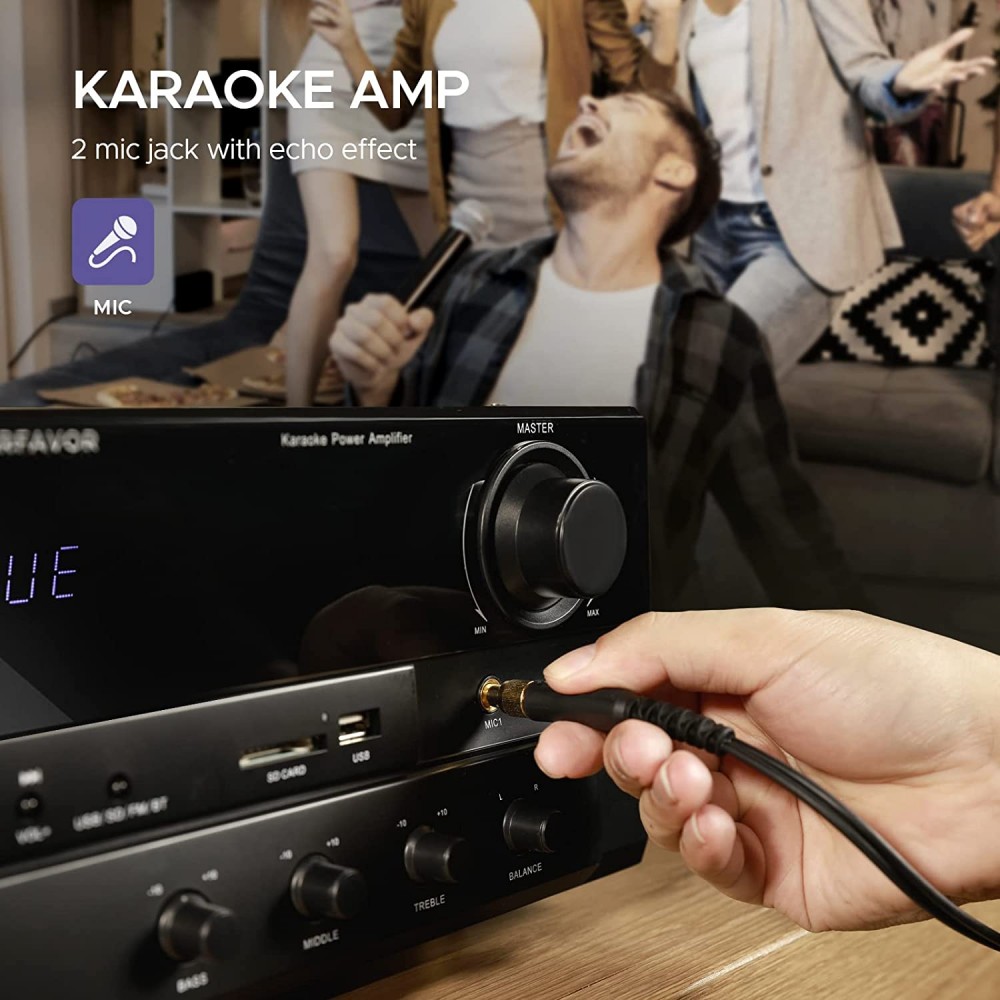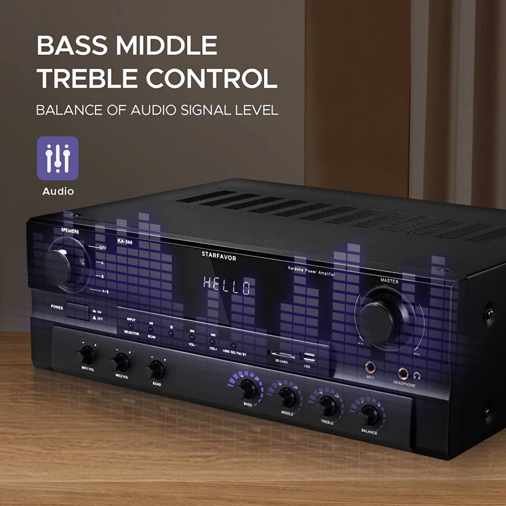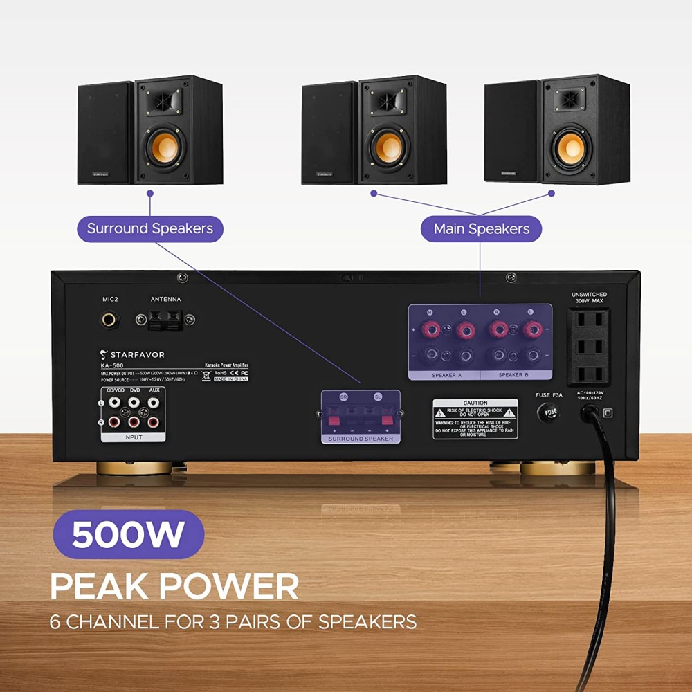 - Múltiples modos de entrada: el amplificador KA-500 de 6 canales cuenta con 3 pares de entrada de audio RCA para reproductores de CD/VCD/DVD, reproductor de discos de vinilo o cubierta de cinta, 2 entradas de micrófono con efecto eco para karaoke en casa, entrada inalámbrica BT, entrada USB y tarjeta SD y función FM.