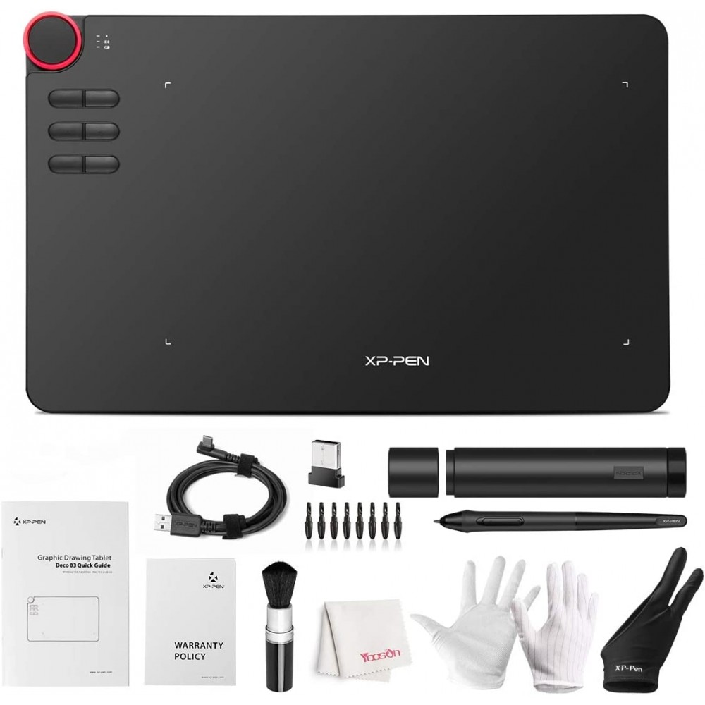 - Esfera roja multifunción creativa integrada para un funcionamiento más rápido, utiliza la esfera funcional girando para un diseño creativo, 6 teclas de acceso corto programables aumentan la productividad y el rendimiento al dibujar con la tableta gráfica DECO 03